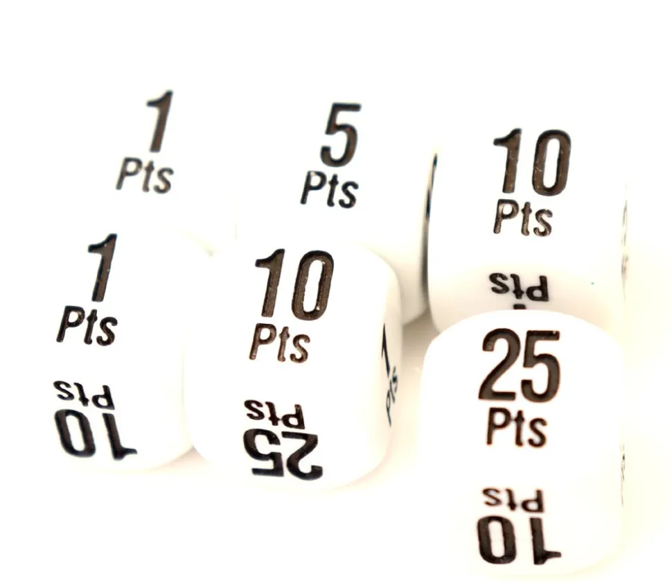 Dé à jouer avec points de jeu avec les faces suivantes +1 pts +1 pts +5 pts + 10 pts +10 pts +25 pts. Dé à jouer blanc coins arrondis de 16 mm avec des points positifs pour ajouter des points lors d’une partie de jeu de société. Dés spécial pour comptage des points ou jeux de mathématiques.