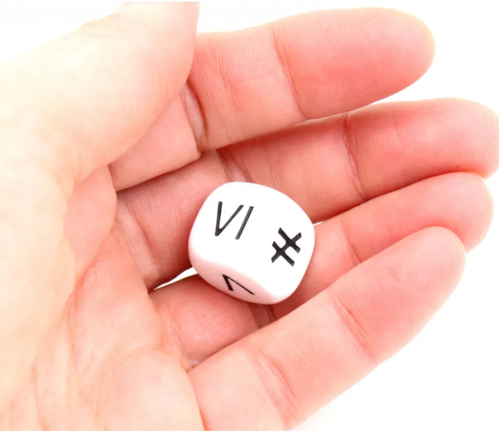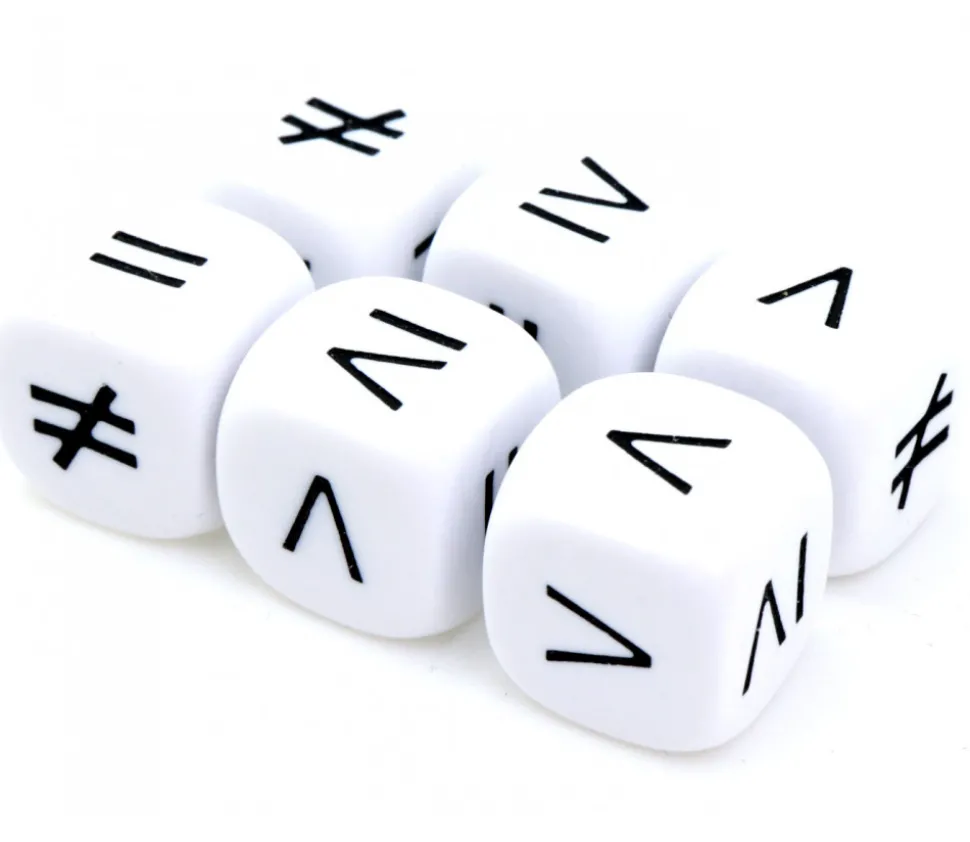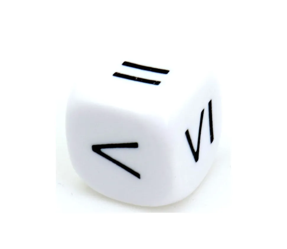 Dé signe de comparaison égal, différent , inférieur, supérieur, inférieur ou égal, supérieur ou égal. Dé à jouer blanc de 16 mm avec des signes mathématiques.