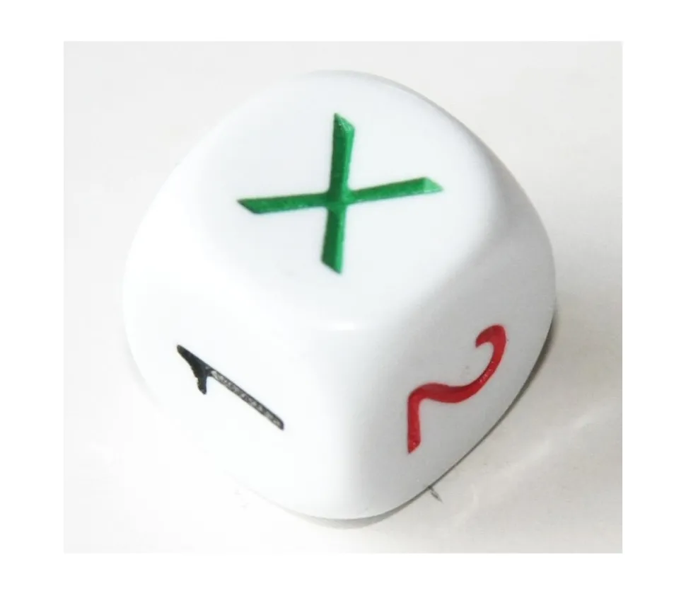 Dé blanc aux coins arrondis avec les chiffres X 1 et 2 gravé chacun d’une couleur. Dimensions : 16 mm de côté.