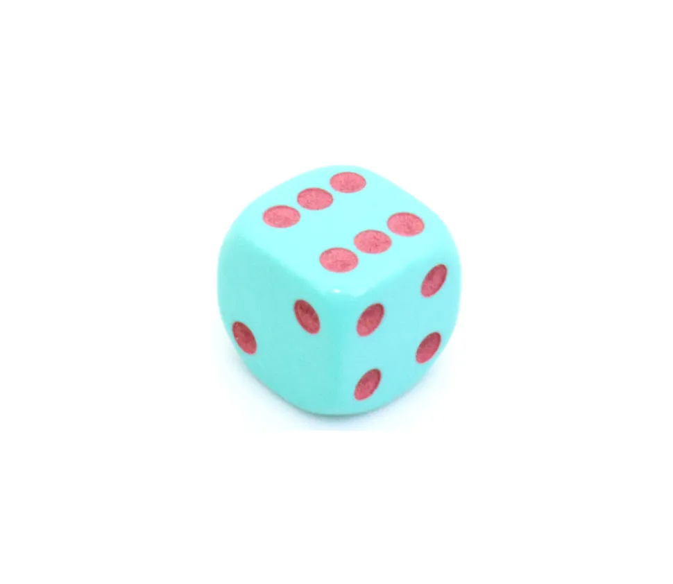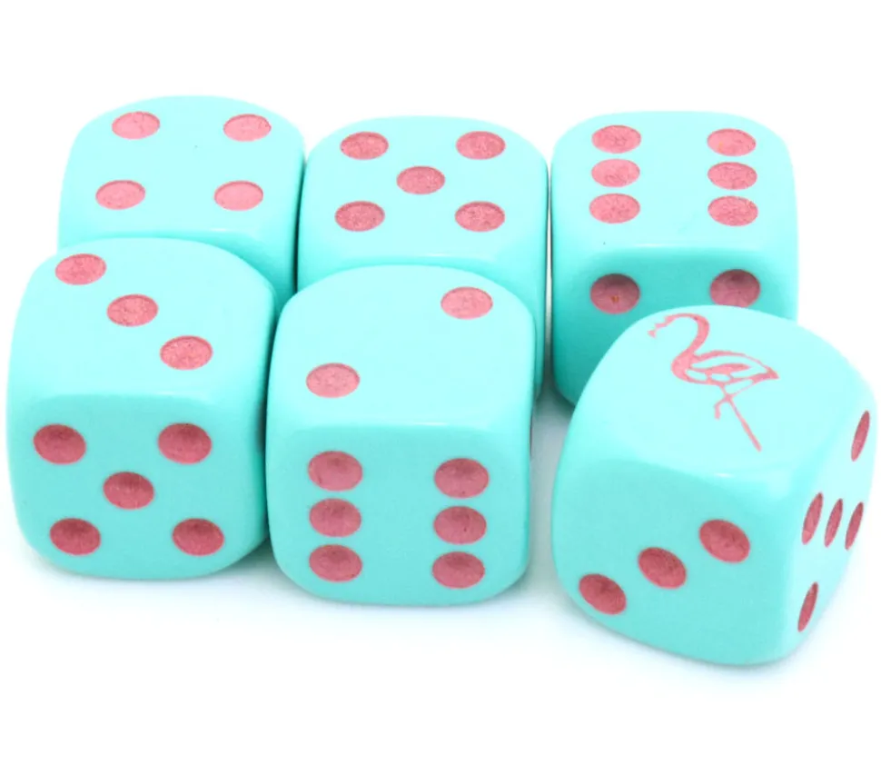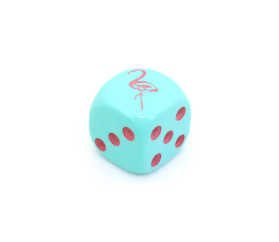 Dé à jouer flamant rose. Dé spécial turquoise avec une face dessin de flamant rose à la place du 1. Les autres faces sont 2 3 4 5 et 6. Dé couleur de base en turquoise. Flamant rose et points de couleurs gravés en rose.