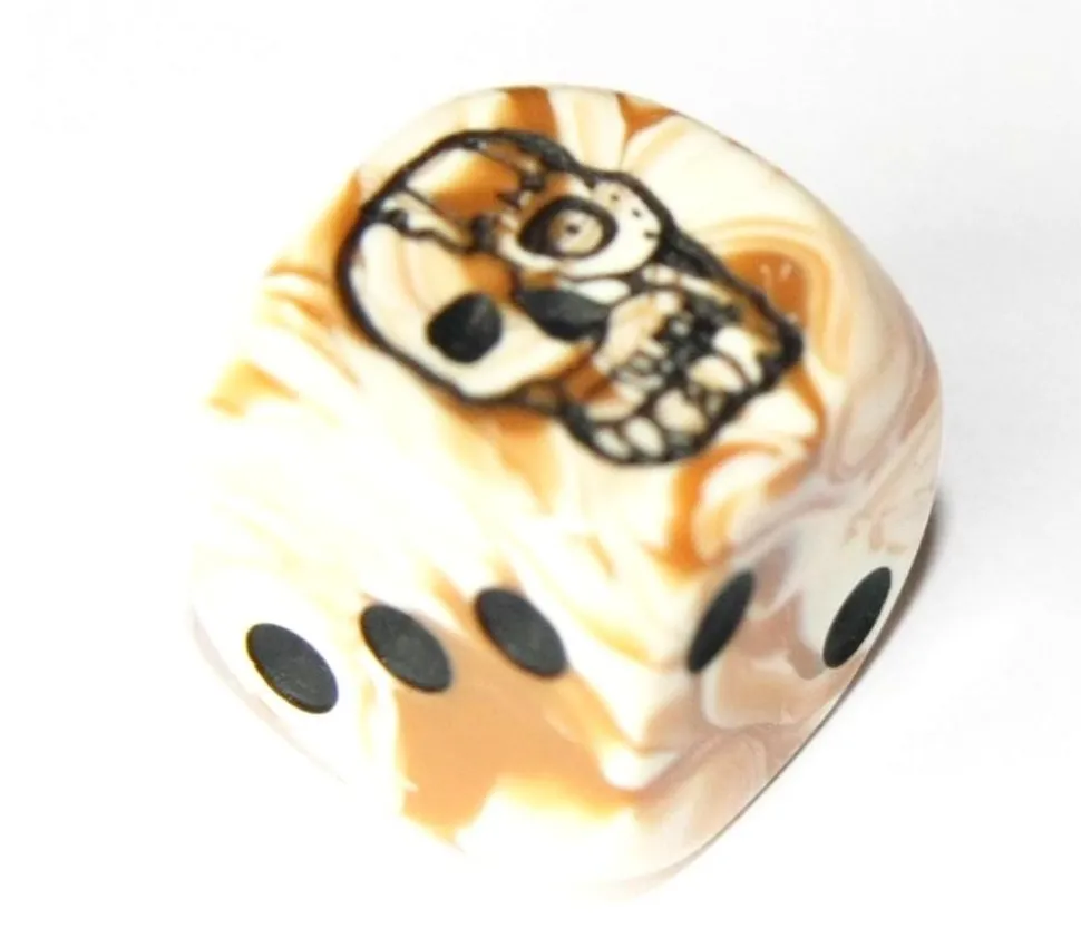 Dé squelette tête de mort. Dé avec marbrure blanc cassé et marron effet os avec un face tête de mort à la place du 1. Les autres faces sont 2 3 4 5 et 6.
