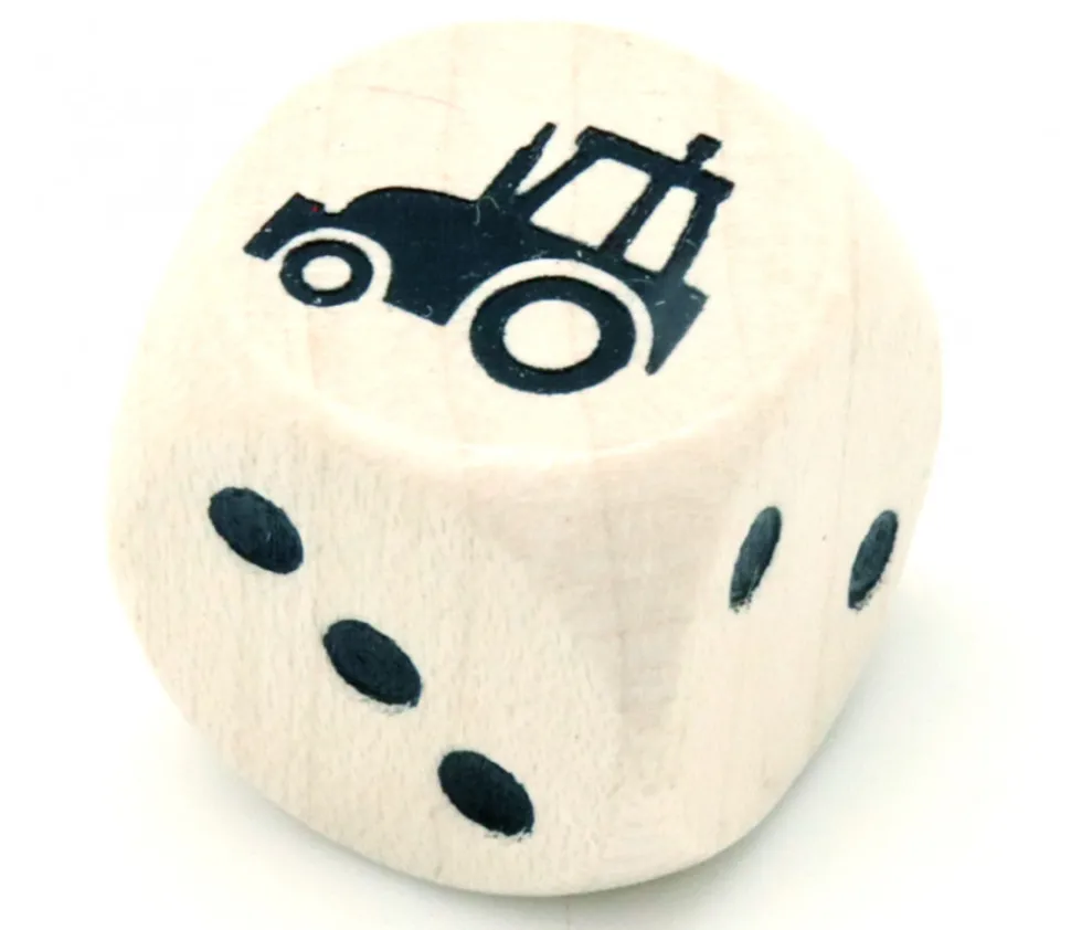Dé tracteur. Dé de jeu en bois avec faces points standard 1 2 3 4 5 et face spéciale tracteur à la place du 6. Un dé à jouer que vous pouvez utiliser pour des jeux avec des règles spéciales. Jeu sur la ferme, la nature. Dimensions du dé : 18 mm.