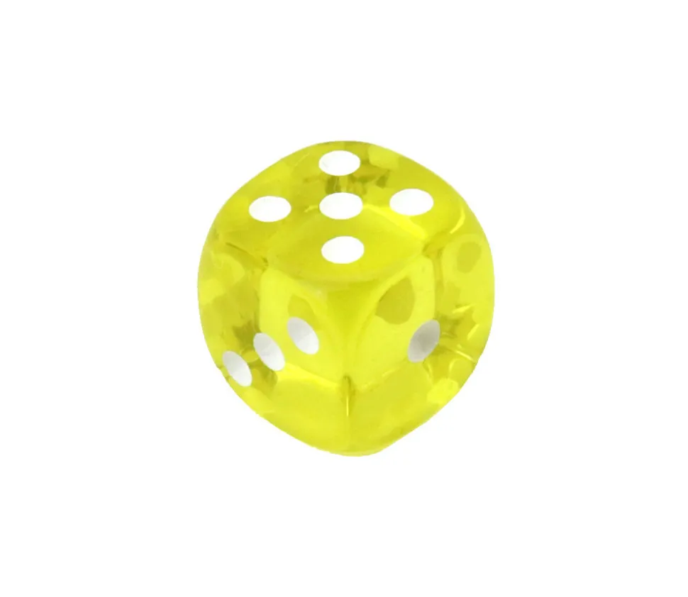 Dé à jouer translucide de 16 mm pour créer ou compléter un jeu. Dé plastique transparent coloré en jaune, on voit à travers le dé. Dé avec des points de 1 à 6 pour mettre de la couleur dans vos jeux.