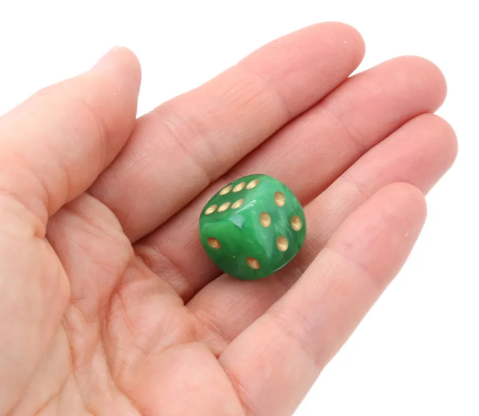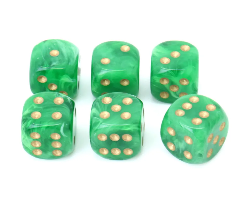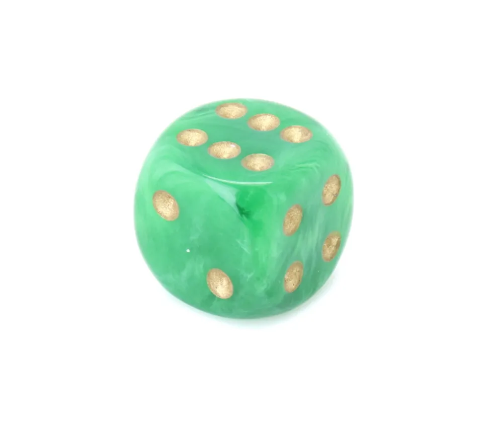 Dé 16 mm Vortex Vert. Magnifique effet de mélange divers tons de verts. Très beau dé coloré à jouer avec points dorés de 1 à 6.