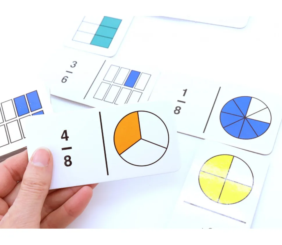 Jeux de dominos sur les fractions : 36 tuiles dominos assez grande de 5.8 x 11.4 cm. Dominos qui permet de travailler les notions de fractions et décimal. Les fractions sont représentés avec les nombres ou visuellement sous différentes formes : rond, carré, triangle, chiffres à virgules, opération. Matériel de qualité à utiliser en classe pour des exercices et activités mathématiques.