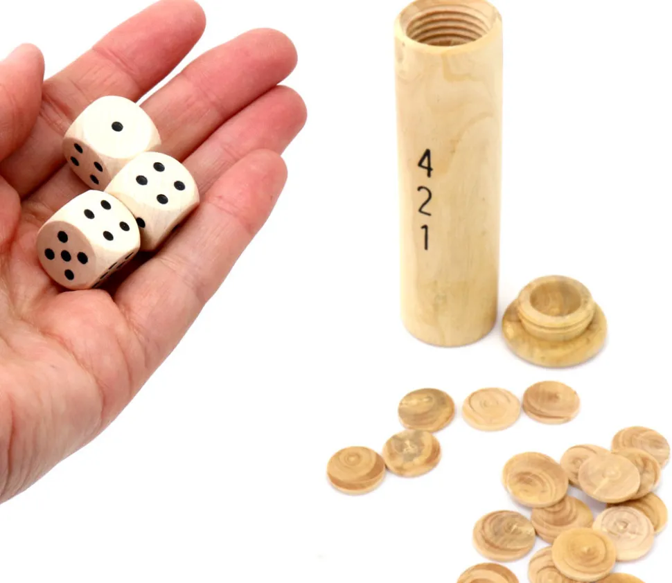 Jeu de dés 421 tout en bois naturel dans un étui en bois. Joli petit tube en bois avec couvercle livré avec 3 dés en bois et 21 jetons pour compter les points.