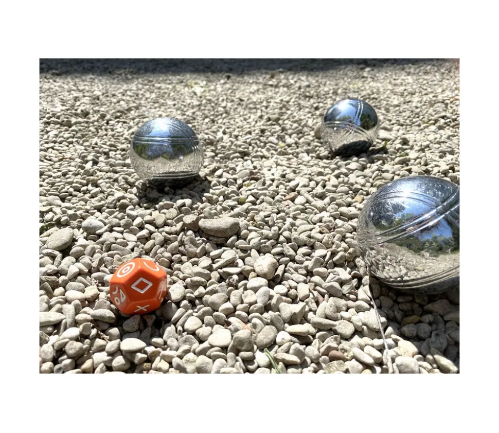 Jeu comprenant 2 dés 12 faces cochonnets avec indications de règles du jeu pour ajouter de la stratégie et du rire à vos parties de pétanque.