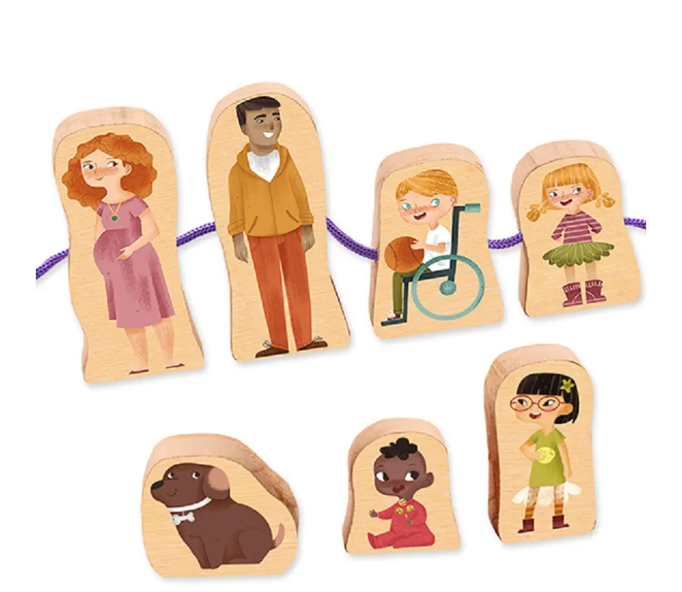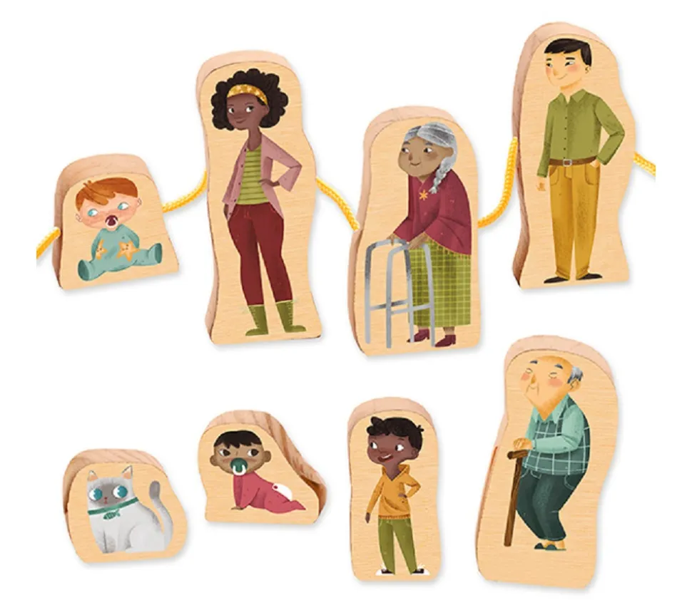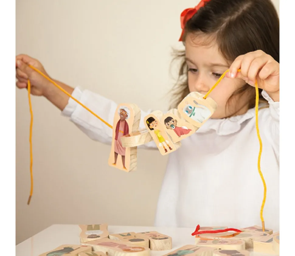 Pièces en bois qui possèdent un trou au centre pour pouvoir les relier entre elles. Personnages de tous les âges (bébés, enfants, adolescents, adultes et personnes âgées) de types et cultures différentes, 1 chien et 1 chat.