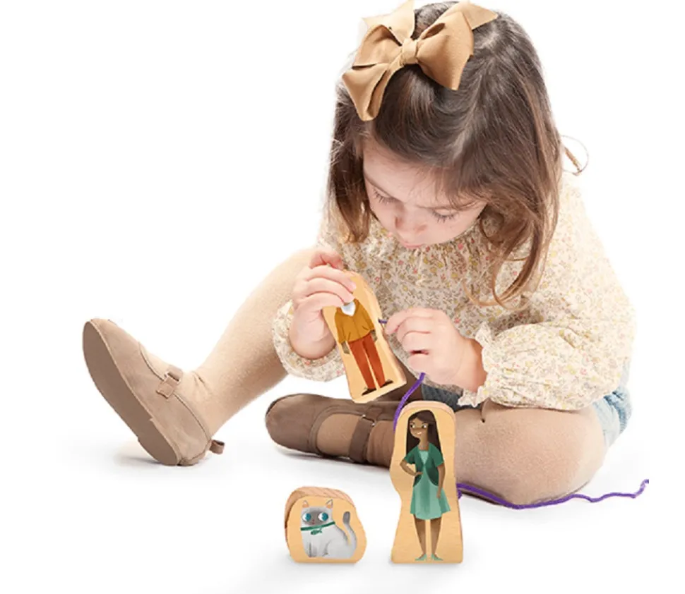 Jeu pour jouer avec les personnages, jeu de laçage, faire des compositions de famille et laisser libre à l’imagination des enfants.