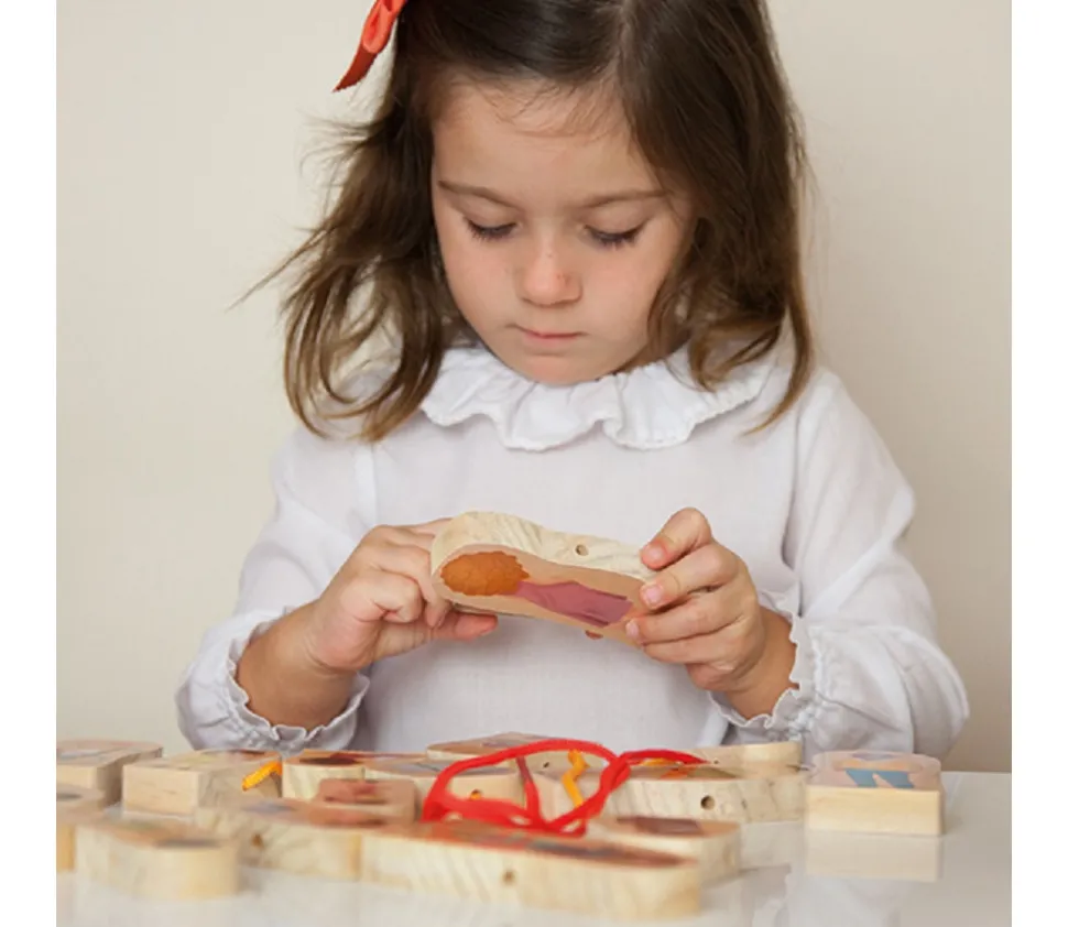 Passer le cordon dans les trous et former une famille avec beaucoup de combinaisons possibles au gré de l’imagination.
