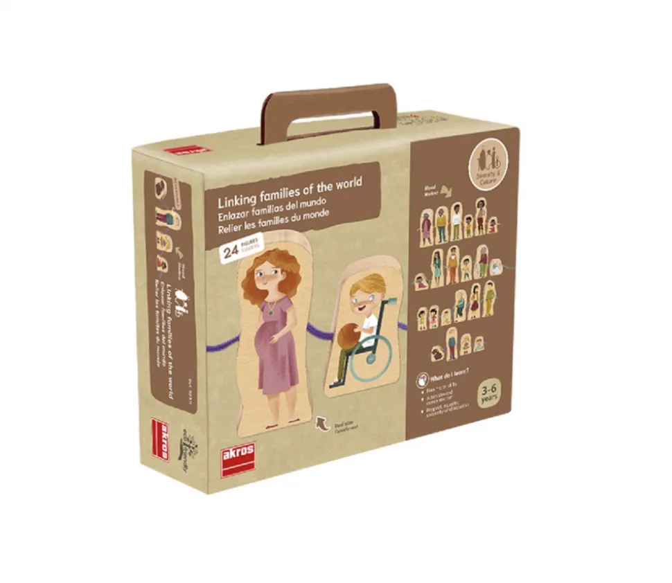 Relier les familles du monde. 24 figurines de qualité en bois épais, imprimées recto-verso qui représentent les familles du monde. Grandes figurines de 5 à 11 cm de haut qui tiennent debout.