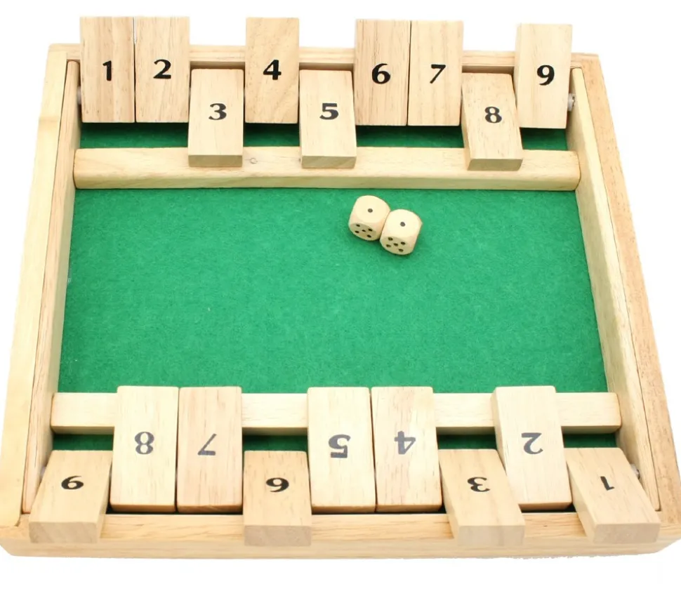 Jeu Fermez la boite pour 2 joueurs avec 9 clapets. Jeu traditionnel en bois avec 2 parties pour jouer à 2 joueurs en même temps. Jeu Shut the Box. Jeu plein de suspens de 1 à 2 joueurs. Jeu de combinaison de dés qui joue avec le hasard et la tactique. Vous ne connaissez pas ce jeu, laissez vous tenter, c’est addictif ! Jeu de clip et clap.