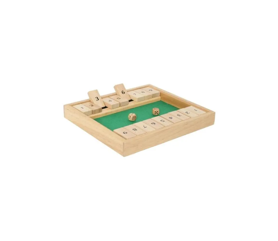 Principe « Shut the Box » c’est fermer la boite en rabattant tous les clapets du jeu. Le joueur lance les 2 dés et peut abaisser un ou plusieurs clapets en fonction du résultat des dés. Le joueur a alors plusieurs choix possibles et c’est tous l »intérêt du jeu. Car suivant le lancer de dés suivant, le choix peut avoir été judicieux ou non. Un jeu simple et sympa, à avoir…