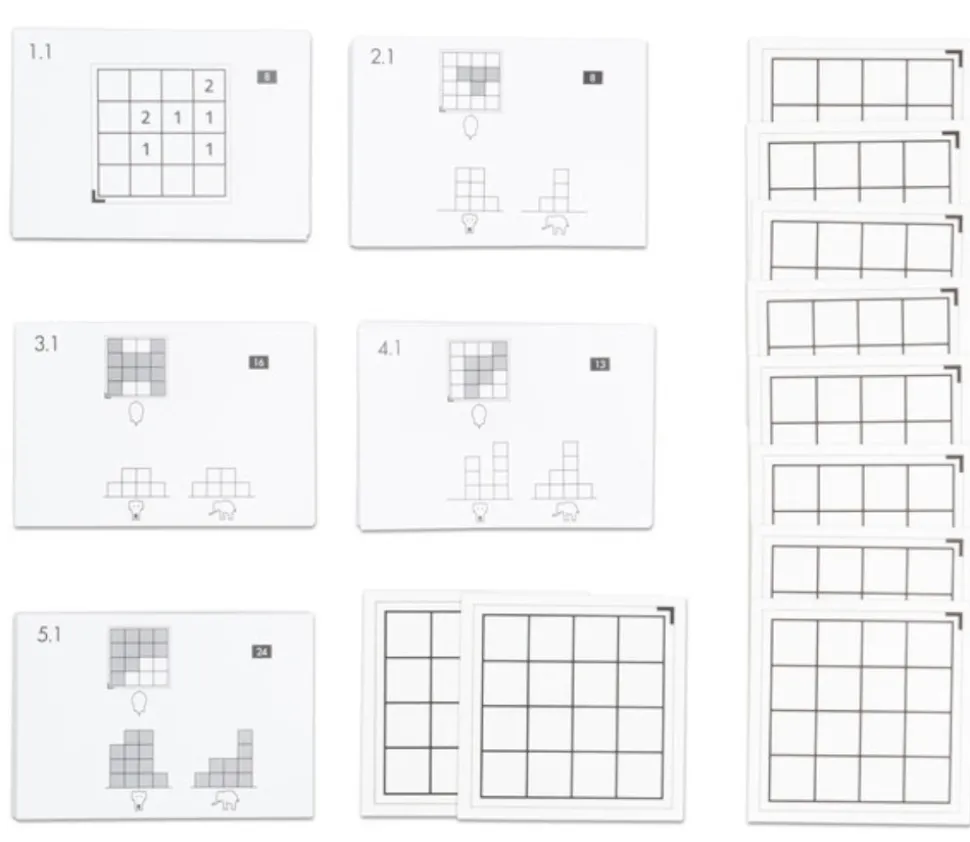 Fiches d’activités pour travailler sur le volume avec des cubes. 5 niveaux disponibles : très facile, facile, moyen, difficile niveau 1, difficile niveau 2. Support modèles pour réaliser des constructions à partir de différents angles de vue. 2 tableaux de travail pour poser les cubes et 12 fiches mission : consigne au recto et solution au verso. Cartes de 13 x 9 cm. Fiches exercices livrées sans les cubes qui sont vendus séparément.