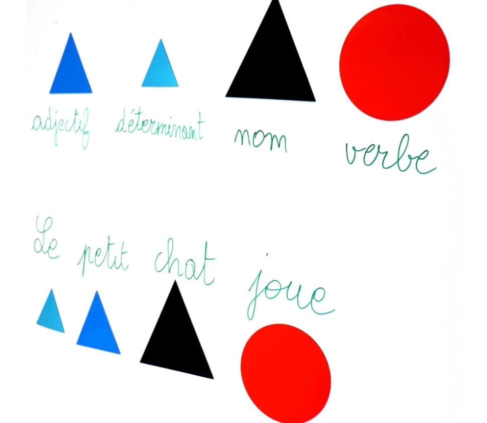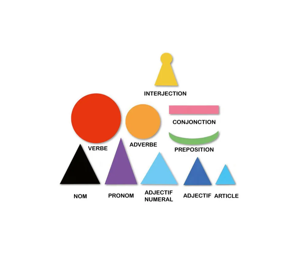 Set de 50 symboles magnétiques grammaire Montessori sous la fome de formes géométriques (10 formes différentes). Chaque forme représente un élément. Pour apprendre les structures d’une phrase et les types de mots qui la composent : nom, verbe, adjectif, adverbe, pronom, chiffres, conjonction, préposition et interjection. Pour visualiser facilement la composition d’un texte et comprendre la grammaire. Taille du verbe : 12 cm. 5 pièces de chaque. Classes grammaticales pour la classe.