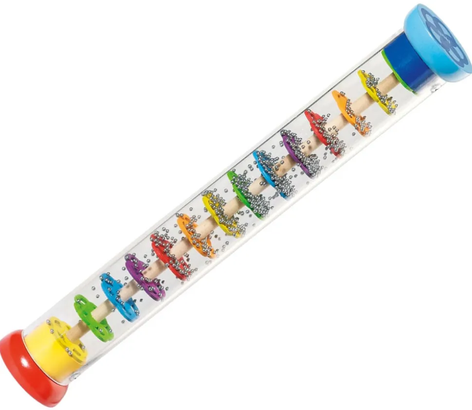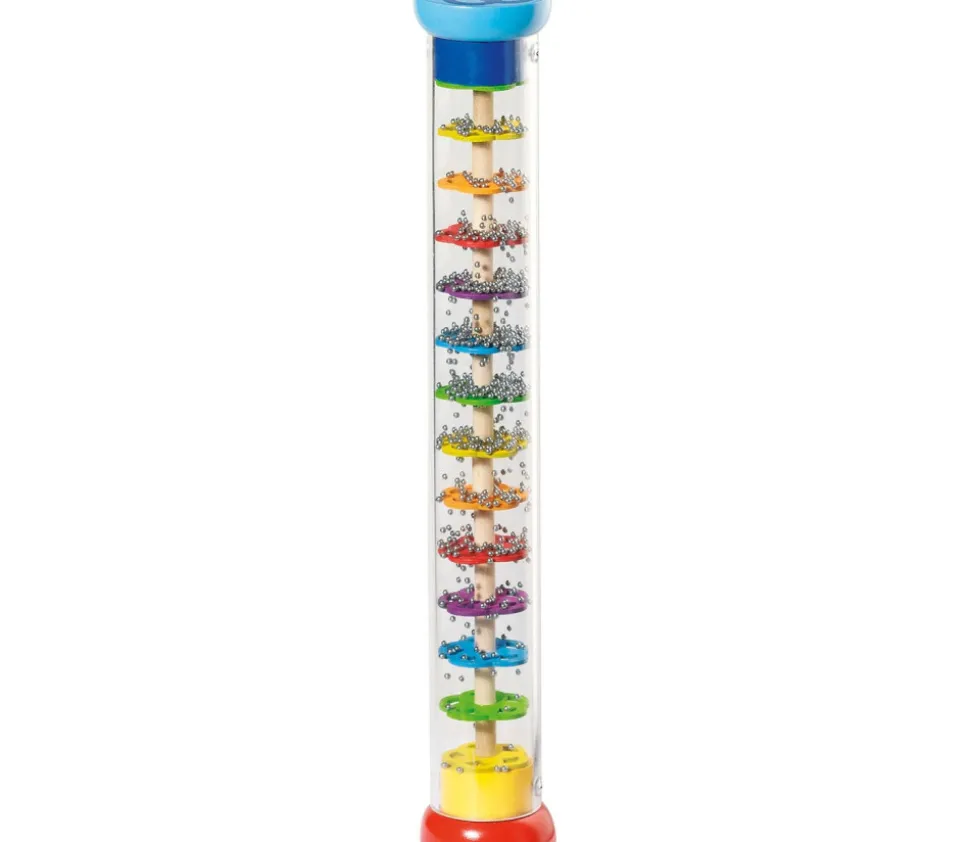 Grand bâton de pluie en bois multicolore. Le tube en plastique transparent permet de voir les billes qui s’écoulent à l’intérieur ce qui donne un atout supplémentaire à cet instrument d’initiation à la musique.
