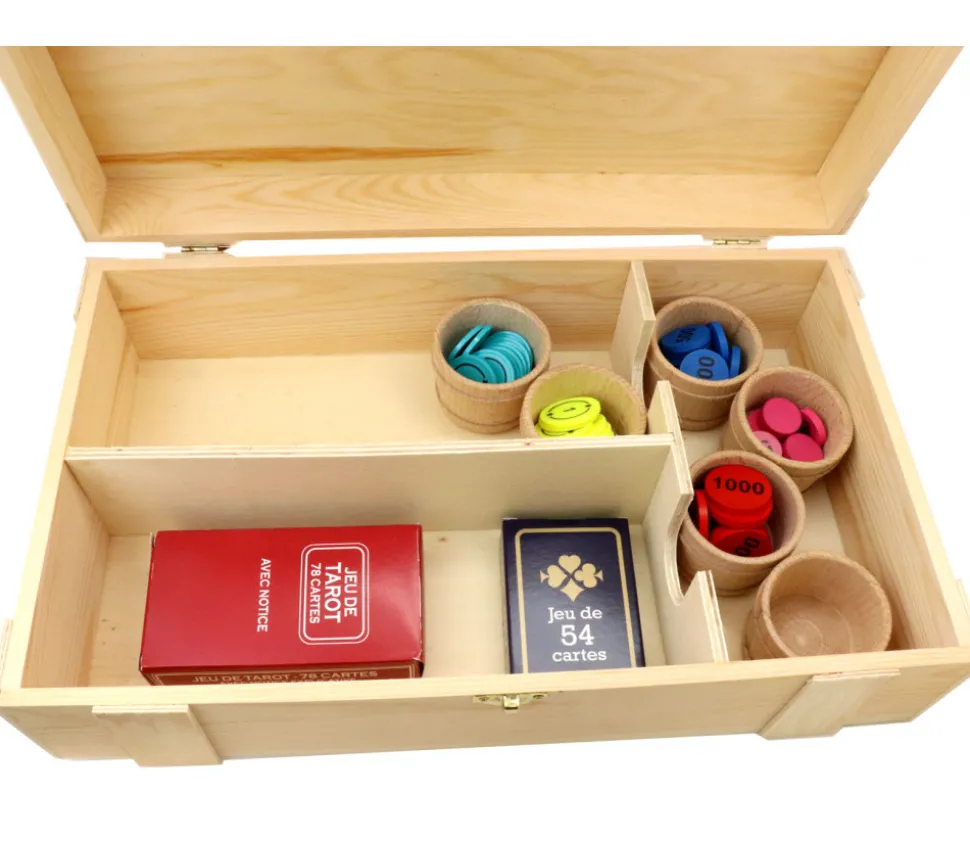 Boite en bois idéal pour ranger dés, pions, jetons, cartes à jouer et sabliers de vos jeux de société. Peut contenir 2 bouteilles de 75 cl