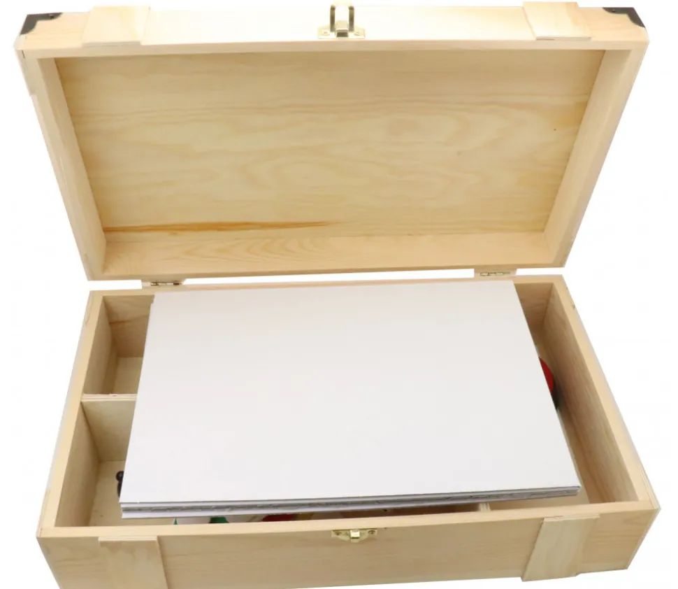 Coffret bois pour accessoires de jeux ou bouteilles. Possibilité de décorer la boite. Boite de 37.5 x 22.4 x 11 cm.