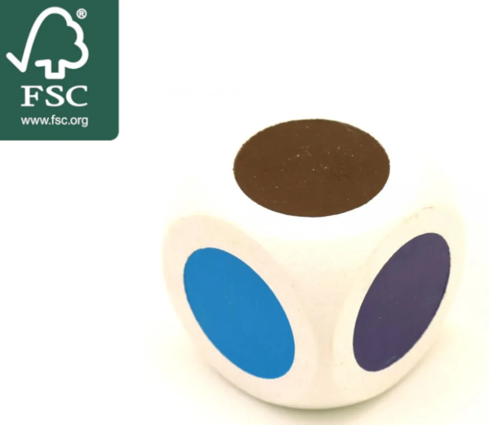 Dé tout bois résistant. Teinté en blanc avec une couleur différente sur chaque côté du dé à jouer. Dé de 30 mm avec coins arrondis pour vos jeux de couleurs.