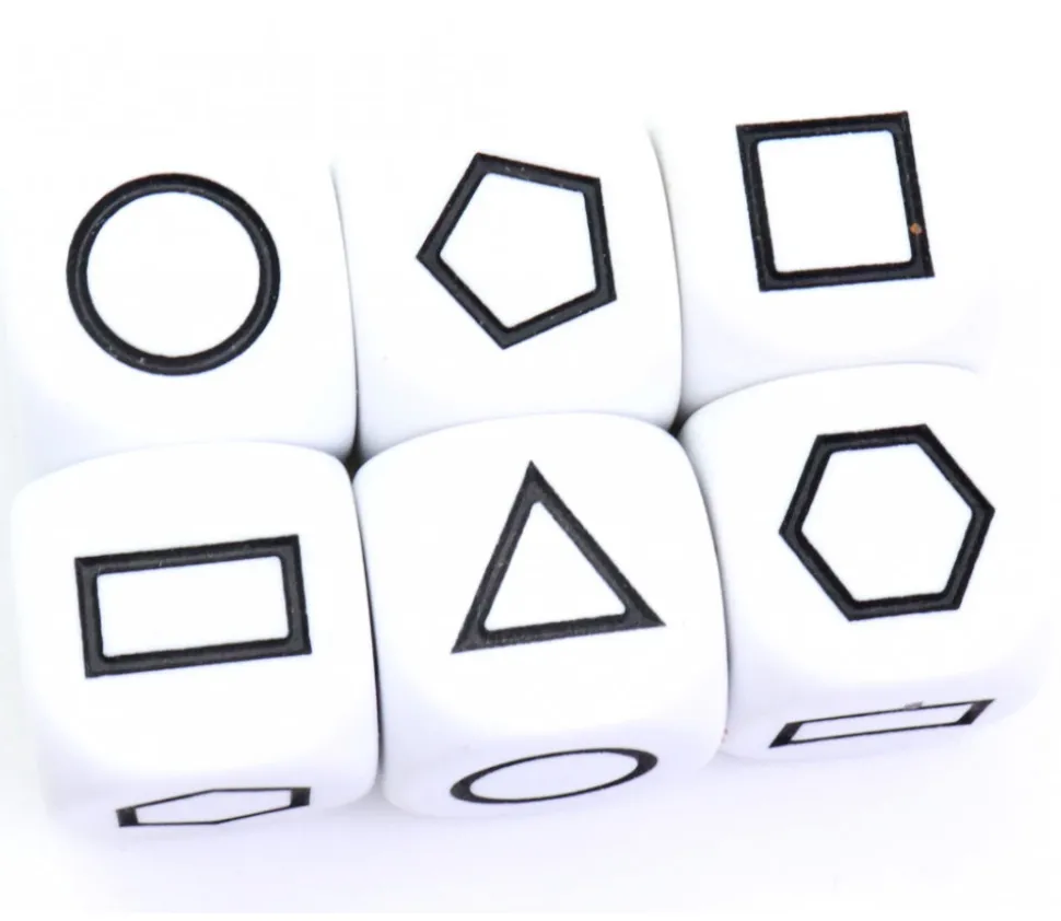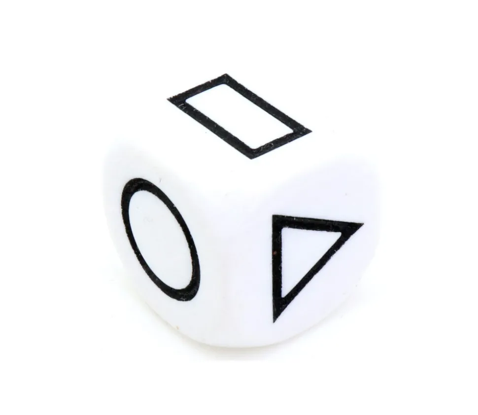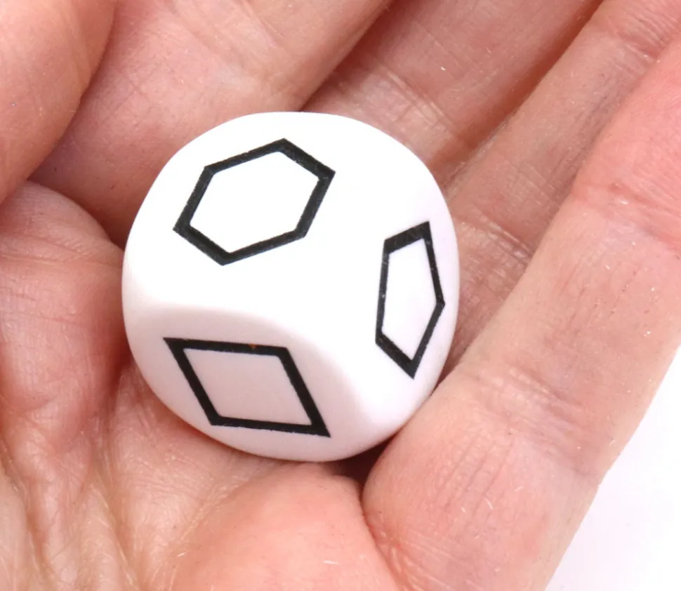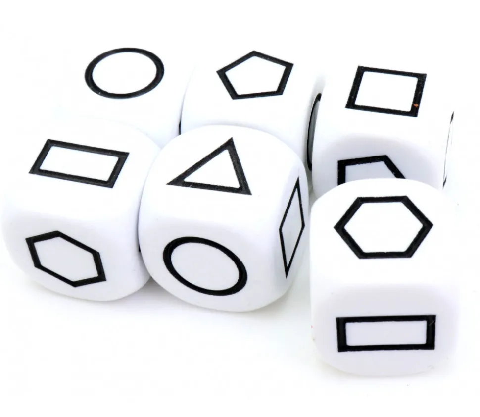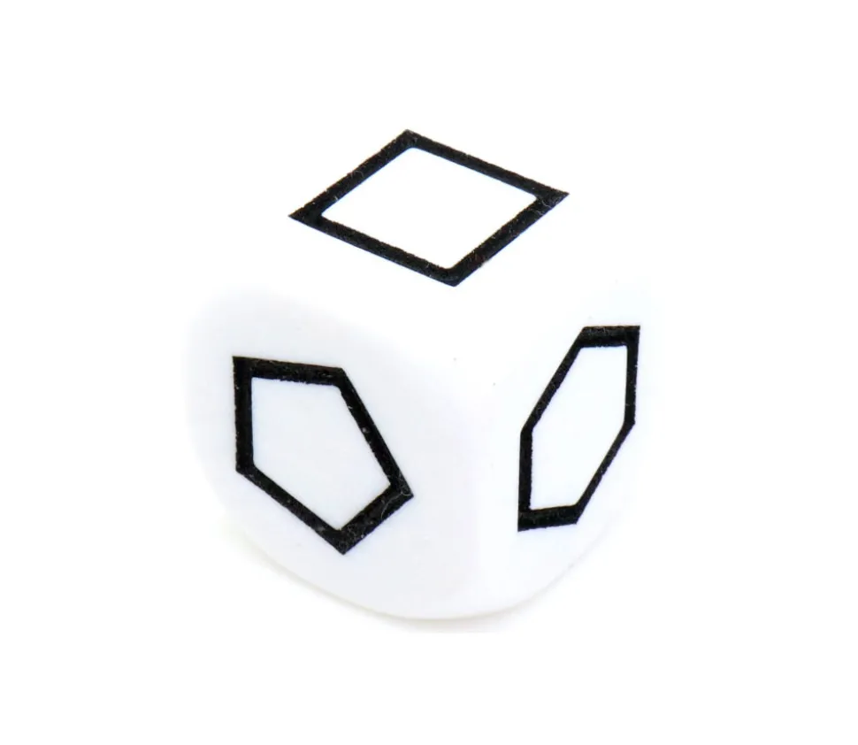 Dé blanc avec 6 faces spéciales gravées représentant 6 formes géométriques différentes : rond, carré, pentagone, rectangle, triangle, hexagone.