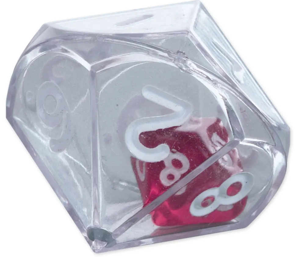 Grand dé en plastique transparent à lancer et qui fait bouger à l’intérieur l’autre dé.