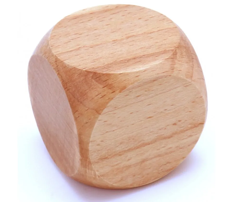 Dé à jouer de grande taille neutre en bois verni naturel 5 cm de côté. Dé vierge sans inscription facile à personnaliser avec un crayon ou en collant des étiquettes ou des gommettes.