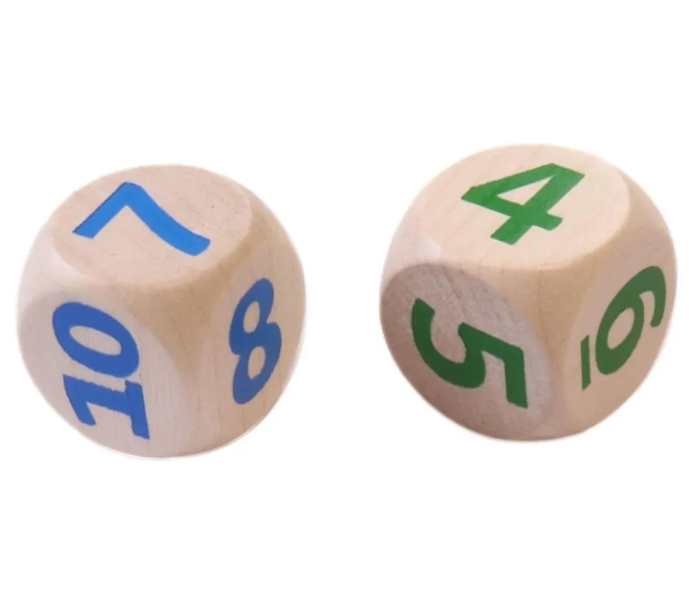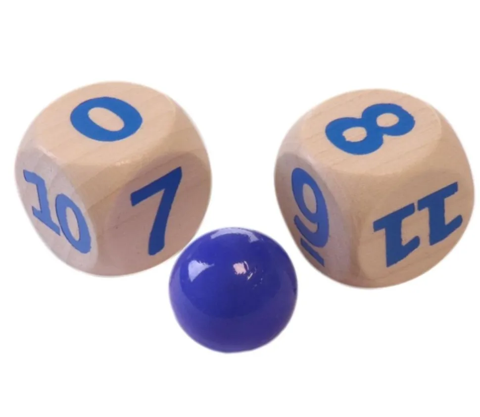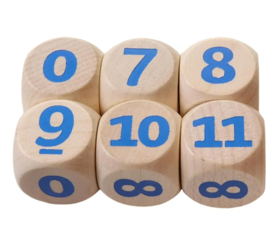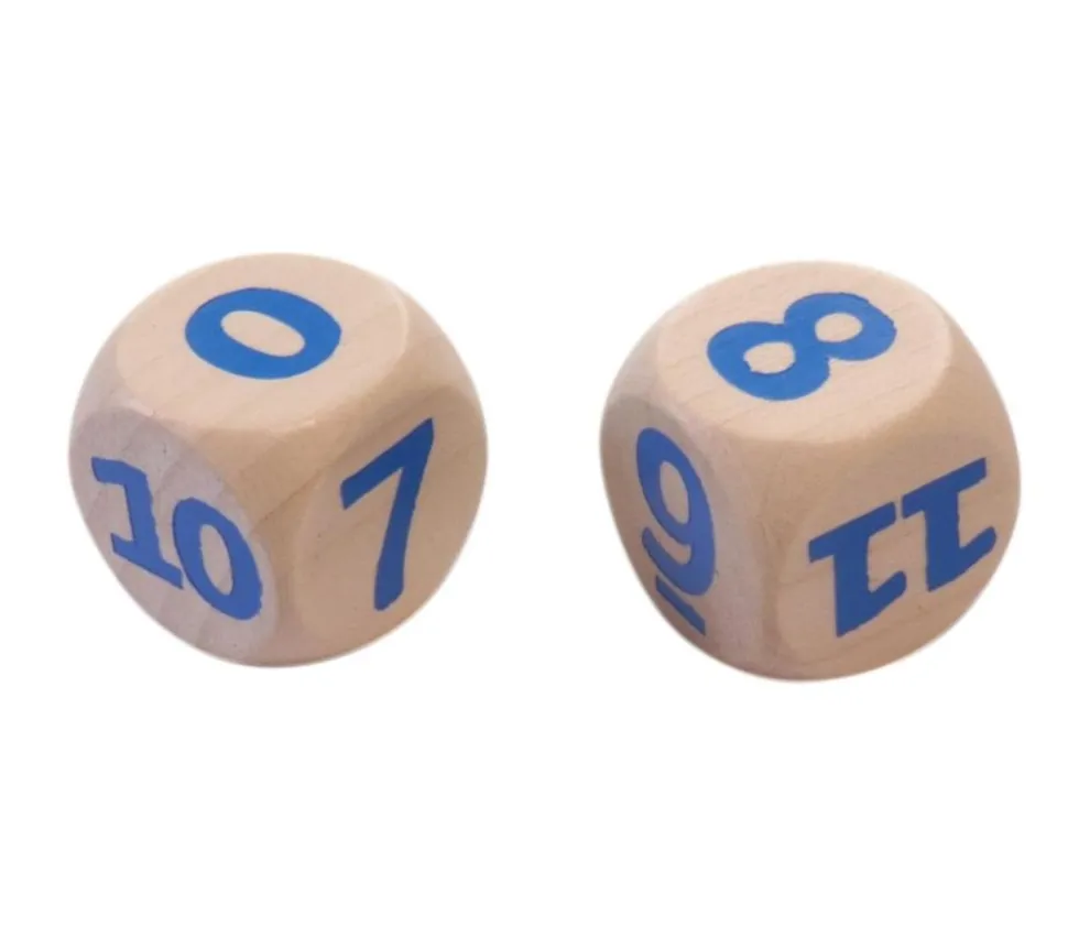 Gros dés en bois de 2 cm avec un marquage spécifique sur les 6 faces du dé chiffres: 0 7 8 9 10 11