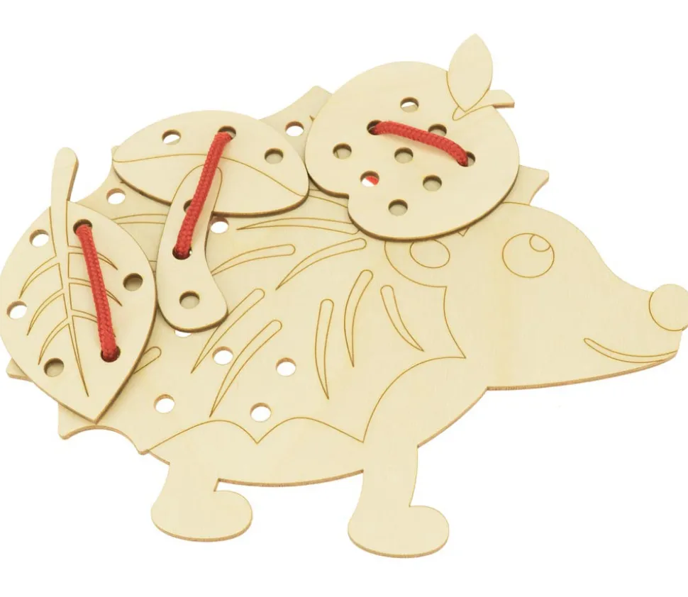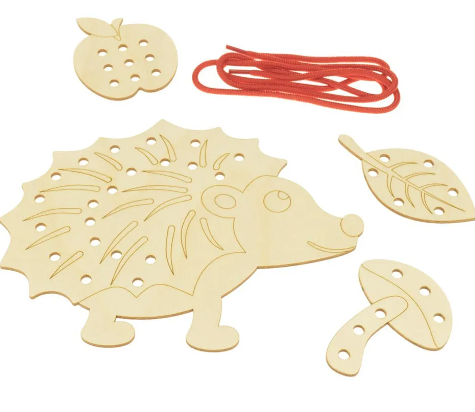 Ce set Hérisson à lacer comprend 1 hérisson de 24 x 15 cm + 1 champignon + 1 feuille + 1 pomme + 1 cordon de laçage.