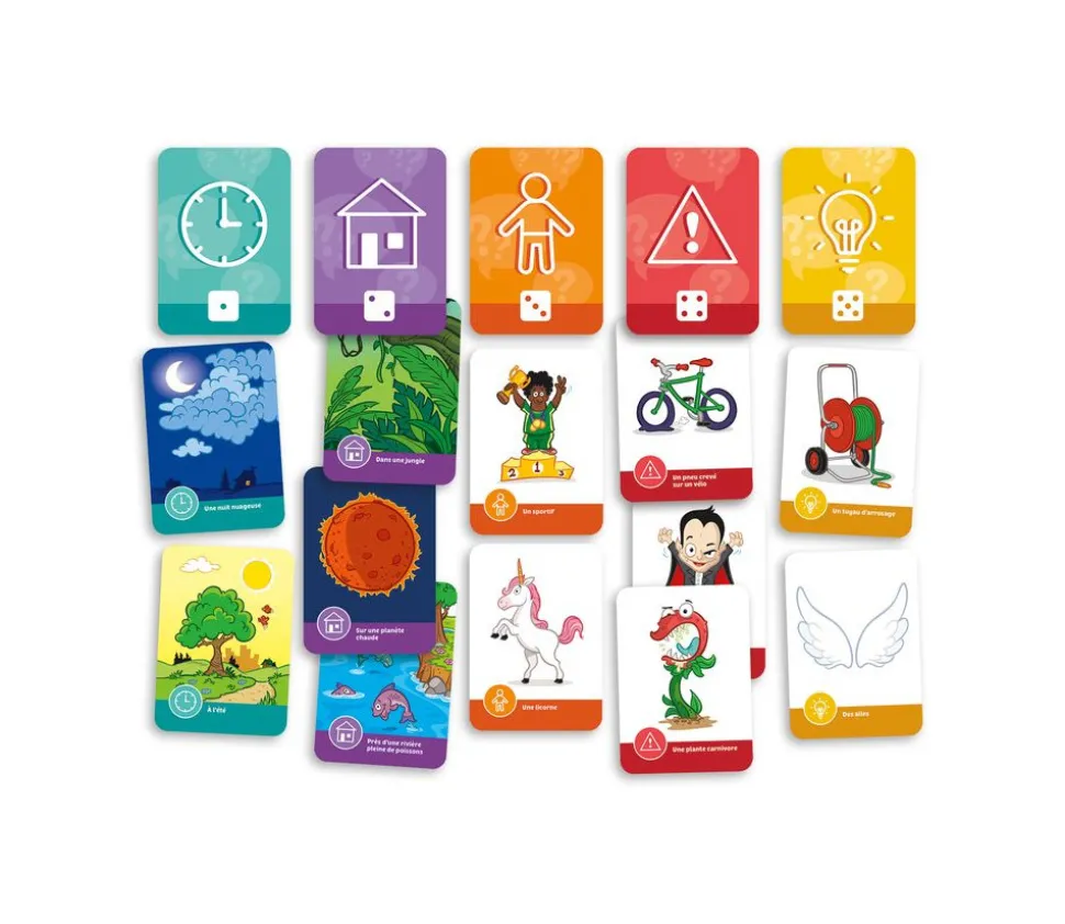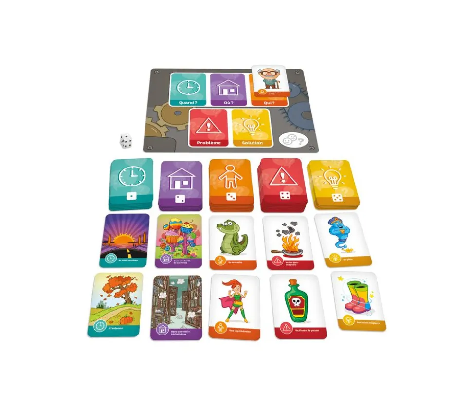 Fais appel à ton imagination pour créer l’histoire la plus amusante! Récolte des cartes qui correspondent au personnage, au lieu, au temps, au problème et à la solution de ton histoire. Raconte-la ensuite aux autres joueurs!