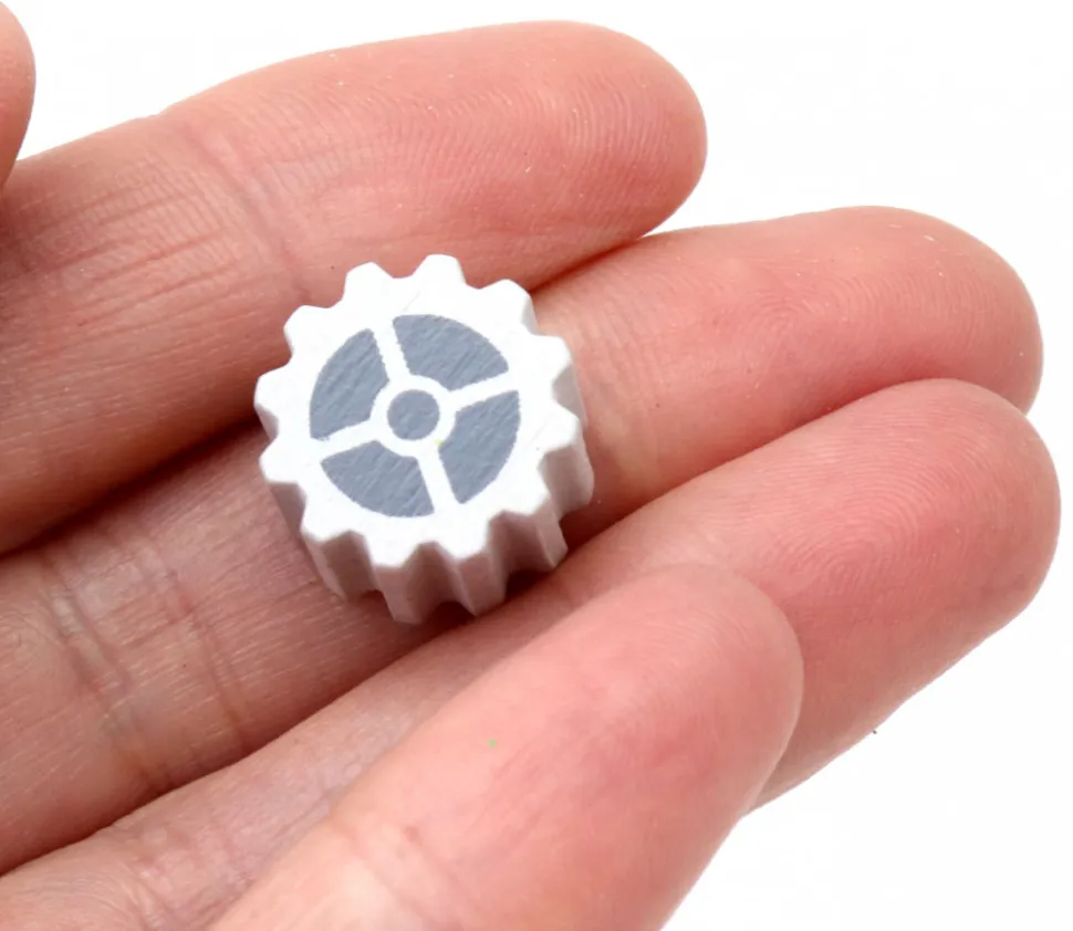 Jeton roue crantée mécanique en bois de 15 mm de diamètre.