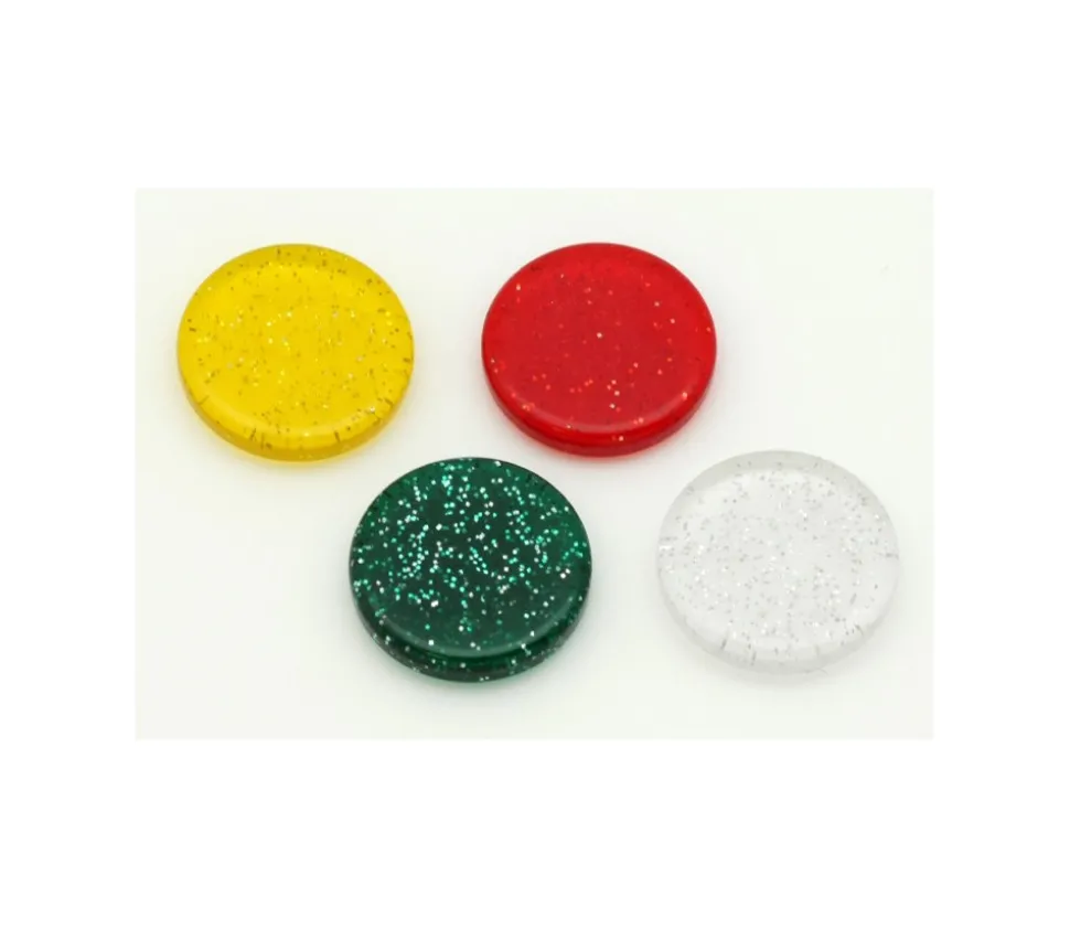 Pion de jeu rond coloré transparent avec paillettes à l’intérieur.