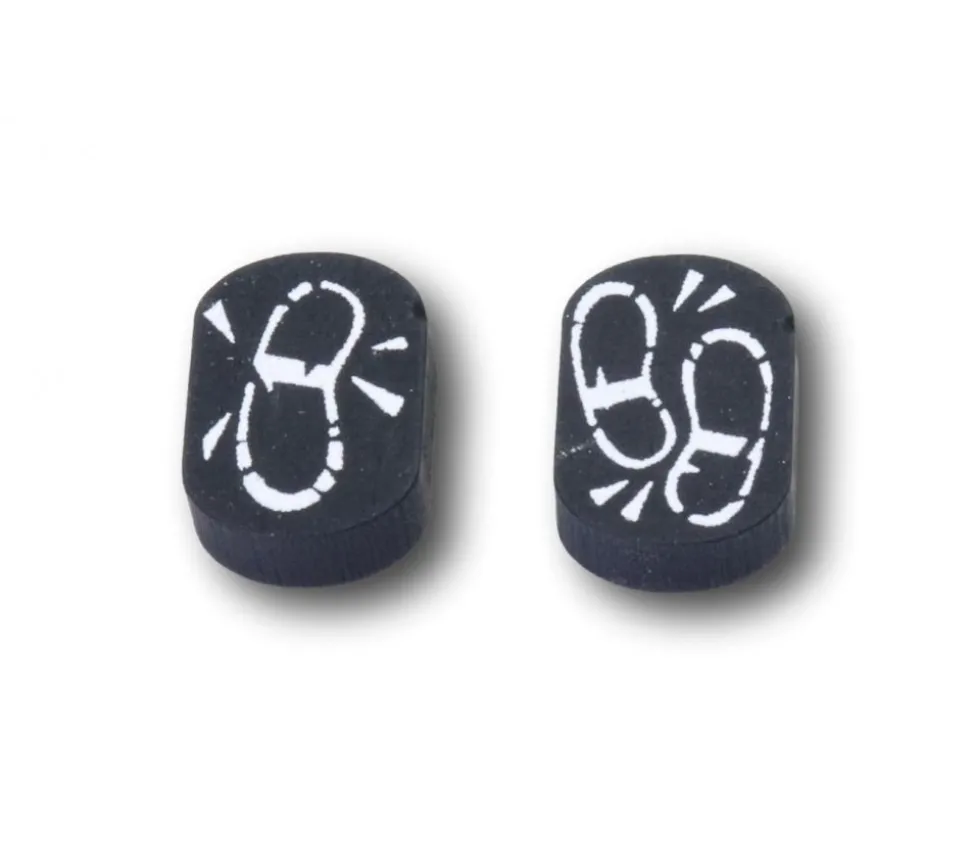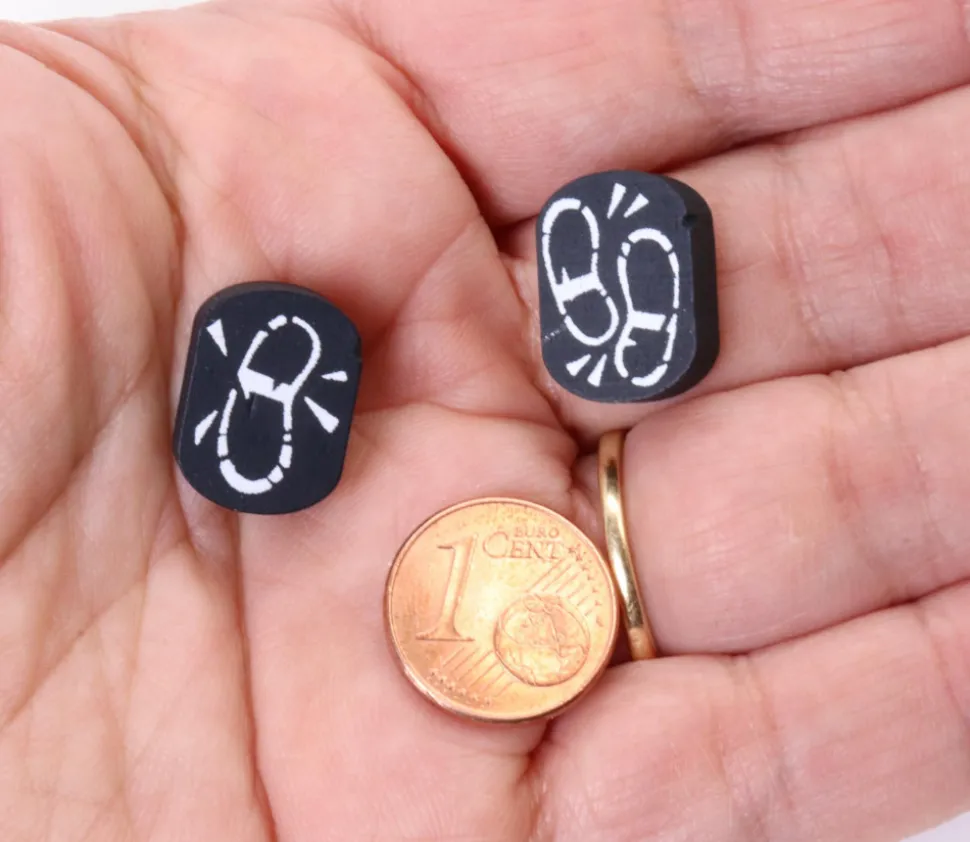Pions en bois rond représentant des traces de pas. Jeton bois teinté en noir avec empreintes de pas imprimées sur les faces.
