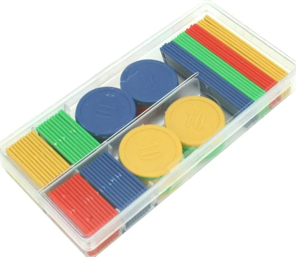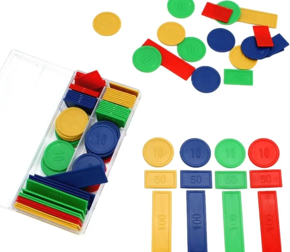 Jetons numérotés avec les chiffres 10 sur les ronds, 50 sur les petits rectangles et 100 sur les grands rectangles.