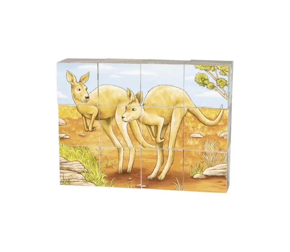 12 cubes en bois imprimés sur les 6 faces pour recomposer 6 puzzles différents représentant 6 différents animaux australiens dans leur milieu naturel