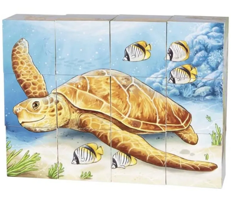 Puzzle en bois constitué de 12 cubes pour former 6 images différentes en fonction des faces des cubes. Illustration d’animaux sauvages avec leur environnement océan, rivière, forêt…