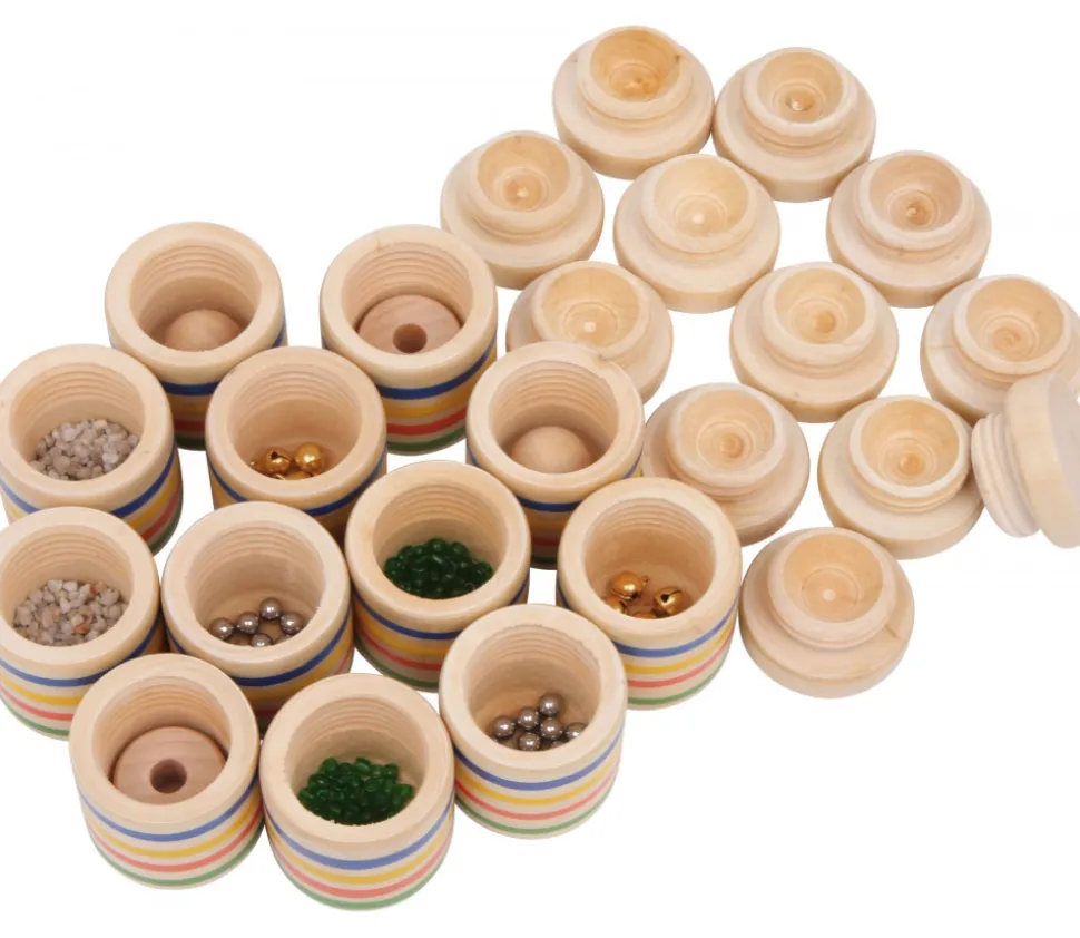Jeu de mémoire basé sur le sens de l’ouïe. Apprenez à écouter les sons et tentez de retrouver les bruits identiques. Mémory des sons. Retrouvez les boites avec la même sonorité. Un superbe ensemble avec de jolies boites que l’on peut ouvrir pour visualiser le contenu et vérifier. Les objets cachés ne font pas le même bruit. 12 boites en bois avec des contenus, que vous pouvez ouvrir pour toucher le contenu ou le modifier pour s’adapter à vos besoins.
