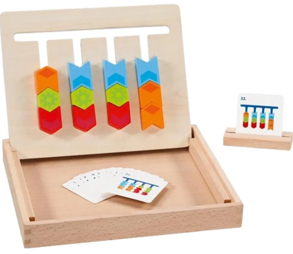 Matériel éducatif tout en bois pour les enfants avec des fiches défis à reproduire.