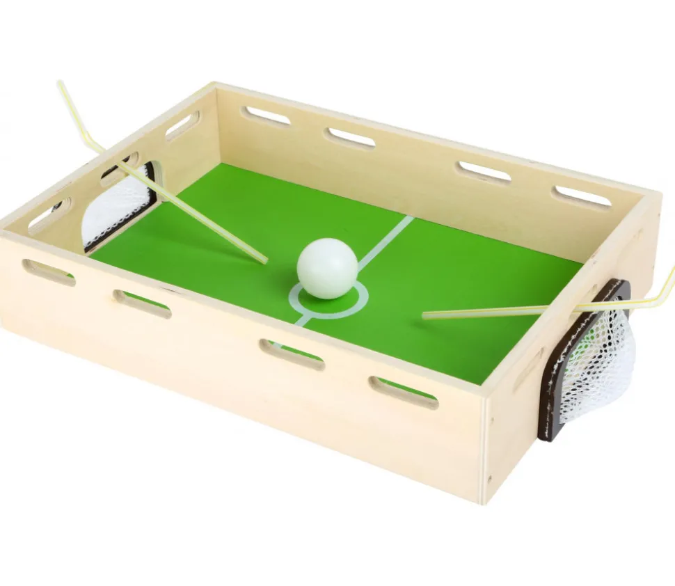 Jeu d’adresse en bois basé sur le souffle. Jeu de foot pour 2 joueurs. Renvoyez-vous la balle et attention à vos buts. Reprenez votre souffle et dosez pour bien viser les buts de l’adversaire. Jeu de souffle super sympa et facile pour jouer à 2. Qui marquera le plus de points ? Un jeu de foot original pour toutes les générations qui ravira petits et grands. Terrain de jeu : 36 x 25 x 7.5 cm.