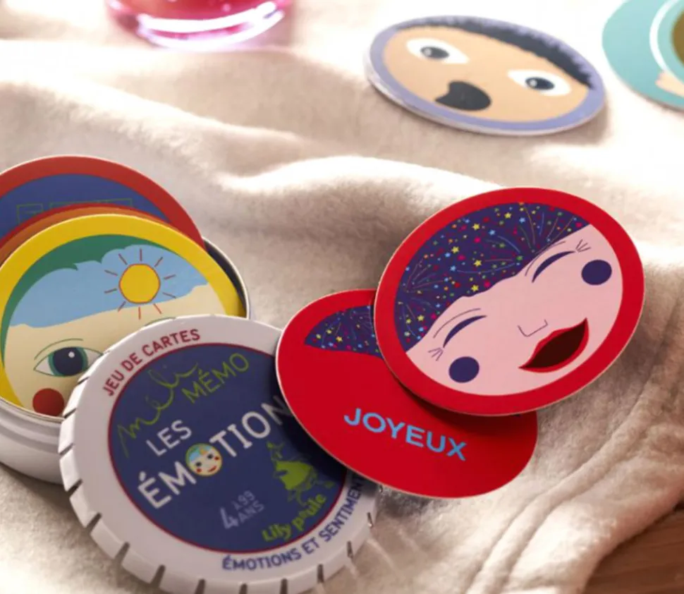 Jeu de cartes sur les émotions et sentiments. Jeu de 32 cartes rondes illustrées pour apprendre aux enfants le sens des émotions et savoir les reconnaitre.