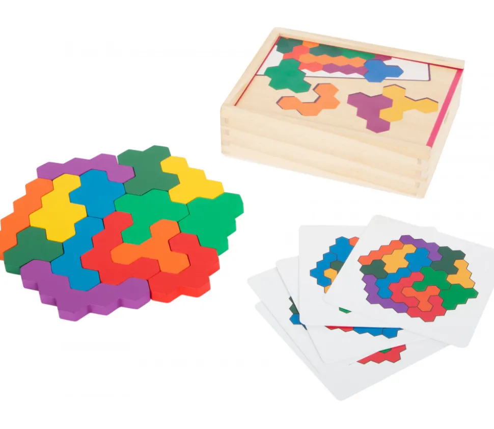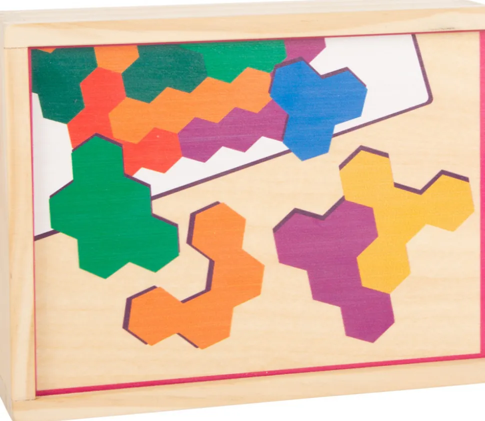Jeu des Hexagones en bois. Puzzle casse tête pour les enfants, apprentissage et manipulation des formes et du repérage dans l’espace.