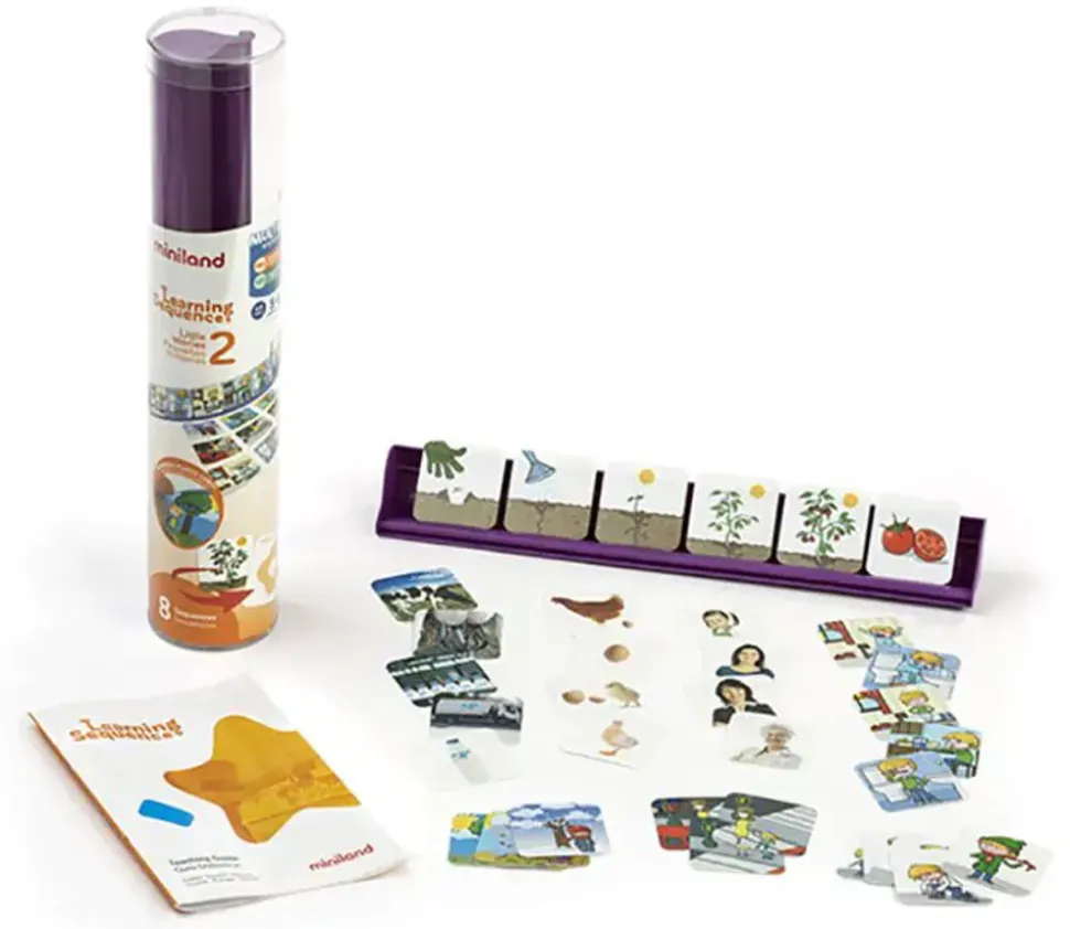 Tuiles Plastifiées : Les tuiles plastifiées durables permettent aux enfants de manipuler les séquences, les plaçant dans l’ordre correct pour créer une compréhension visuelle.