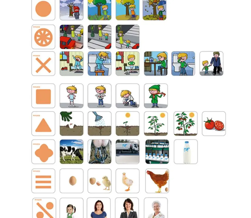 Jeu avec des séquences de vie du quotidien, cycles de vie (poule, tomate, évolution de la vie), découverte du monde (production du lait). Tuiles avec des images séquentielles plastifiées ultra résistantes.