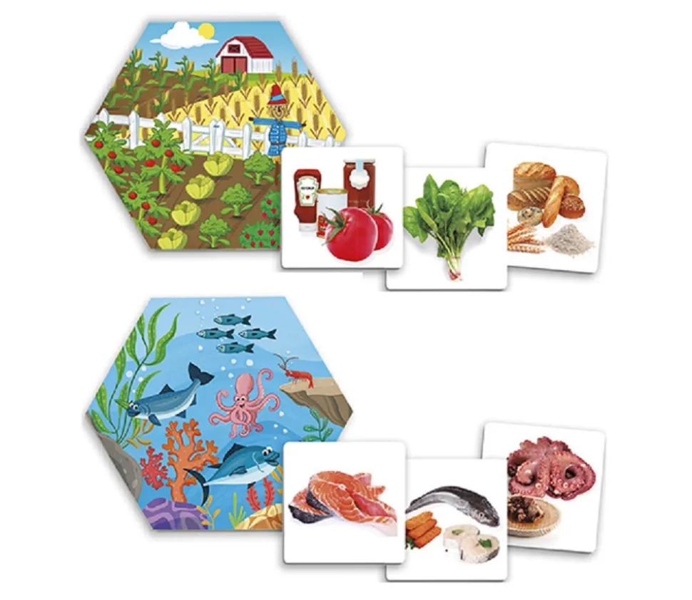Jeu d’association : D’où viennent les aliments ? Pour apprendre où poussent et d’où proviennent les aliments que nous consommons. Ce jeu permet aux enfants d’identifier les aliments et savoir d’où ils viennent : de la terre, de la mer, des animaux, des arbres ? Il faudra positionner au bord des grandes cartes hexagonales les aliments correspondants à l’illustration. Un jeu avec cartes autocorrectives au verso.