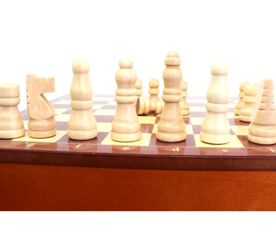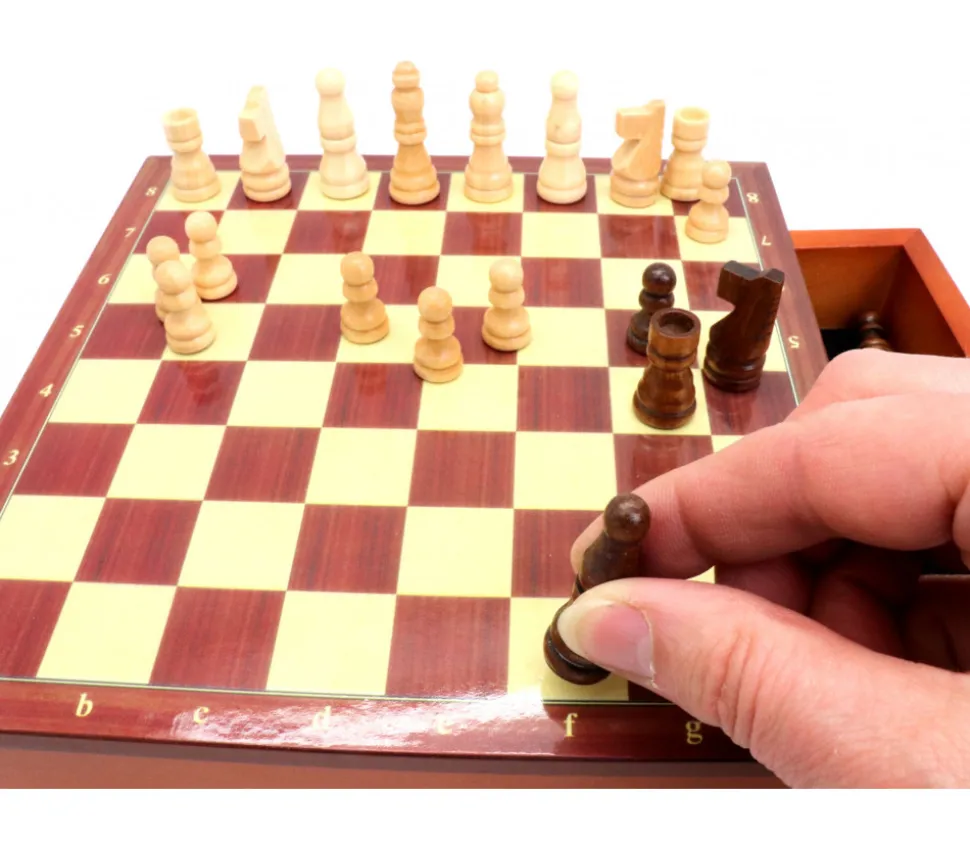 Coffret avec tiroir petit modèle. Jeu d’échec en bois complet avec pièces aimantées. Jeu d’échecs magnétique très pratique avec tous les pions qui se rangent dans le coffret. Plateau : 19.5 x 19.5 x 4.8 cm.