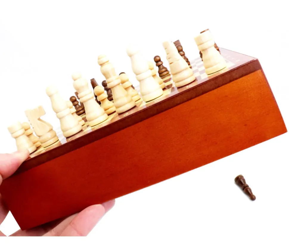 Jeu d’échecs complet petit modèle tout en bois avec pièces de jeu aimantées :
