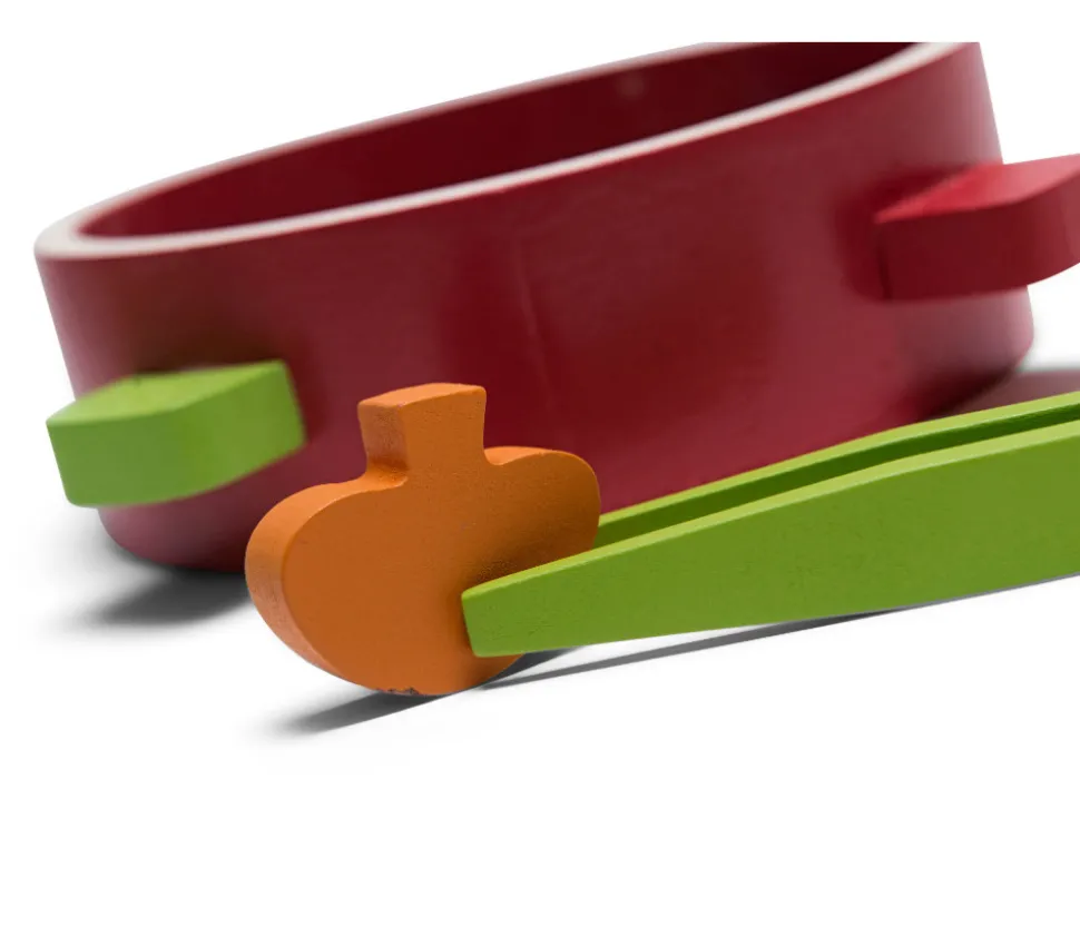 Jeu en bois Veggie Wok. Un superbe jeu de motricité fine. Lancez le dé et attrapez un légume de la couleur correspondante dans la grande casserole grâce à une pince. Vous devez le déposer délicatement à sa place sur votre assiette. Attention de ne pas le faire tomber, il ne faudrait pas gaspiller la nourriture ! De 2 à 4 joueurs à partir de 4 ans. Pour les débutants, les enfants peuvent d’abord s’exercer sans le couvercle à fil pour plus de facilité. Un joli jeu pédagogique tout en bois qui donne envie aux enfants de jouer.