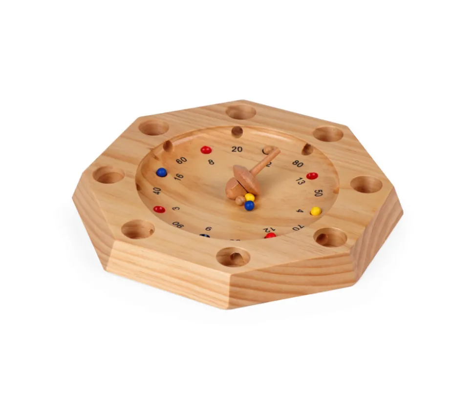 Jeu de super roulette en bois. Grande Giroulette de 32 cm. Un jeu d’adresse avec une toupie et des petites billes colorées en bois qui s’appelle aussi parfois virolon, roulette tyrolienne ou roulette folle.