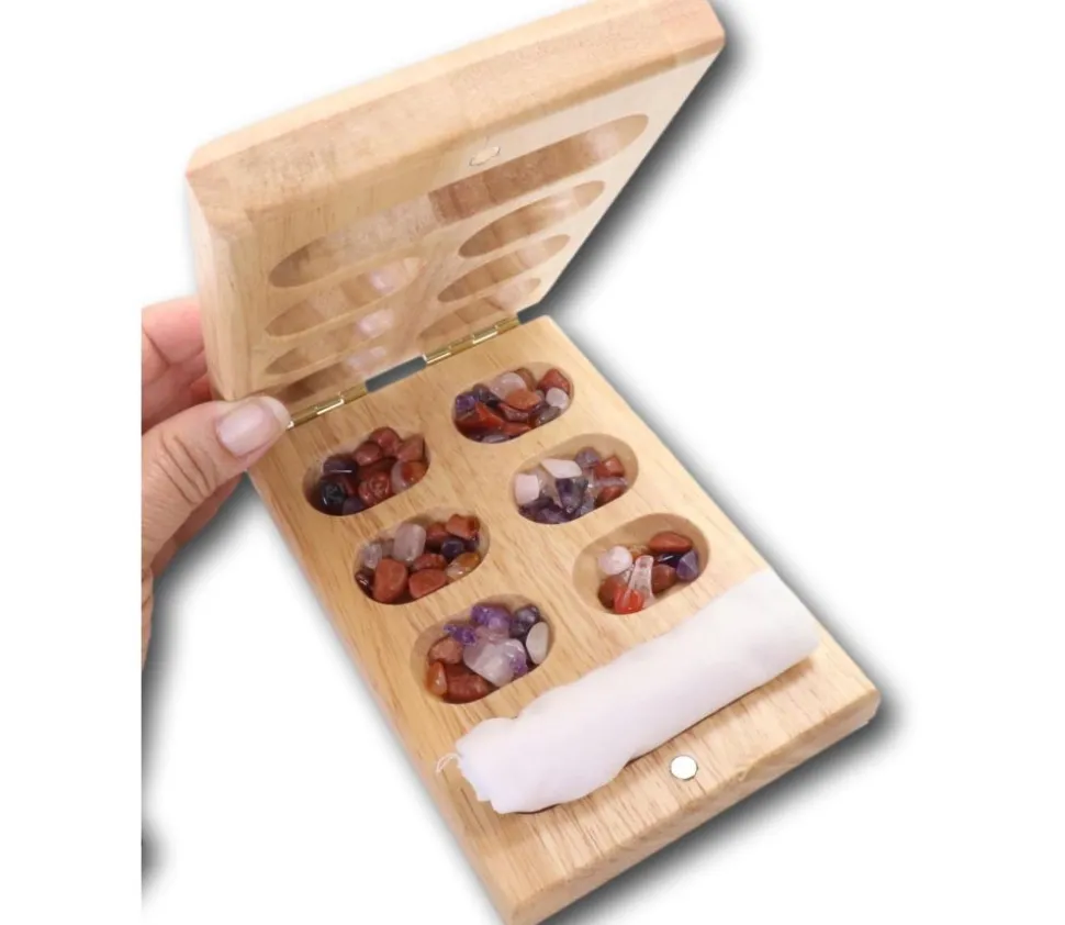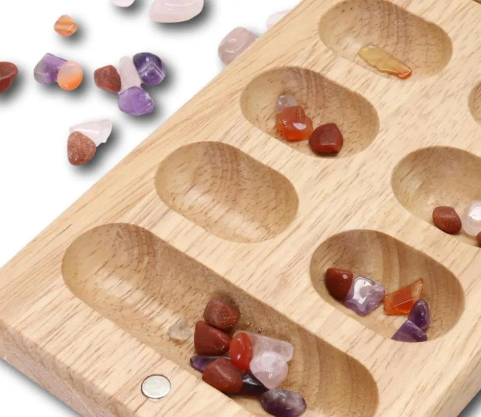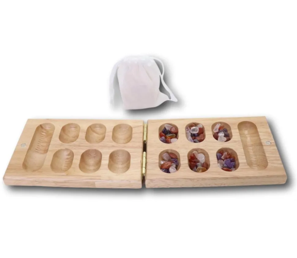 Kalaha tout en bois qui se replie, parfait pour le rangement ou jouer en voyage. Belle finition pour ce plateau de jeux avec des petites cases creusées dans le bois. Pions en pierres naturelles de différentes formes et couleurs.