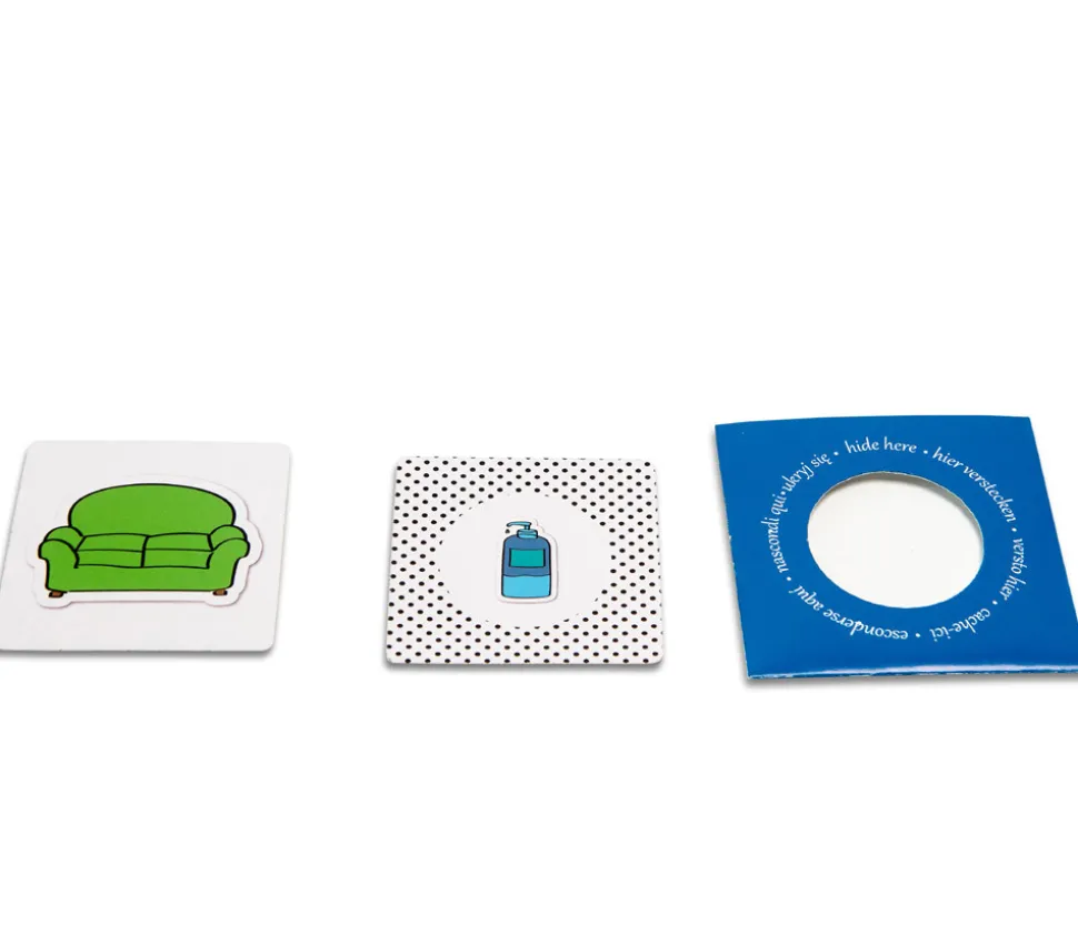 Puis il décale les colonnes et place les cartes dans les enveloppes. Par la fenêtre de l’enveloppe on voit l’objet recherché. En ouvrant l’enveloppe les enfants découvrent la deuxième carte (à pois) qui est le nouvel objet à trouver. On cache les enveloppes dans les lieux où se trouvent les objets (le canapé, les bottes dans l’armoire à chaussure, etc.).