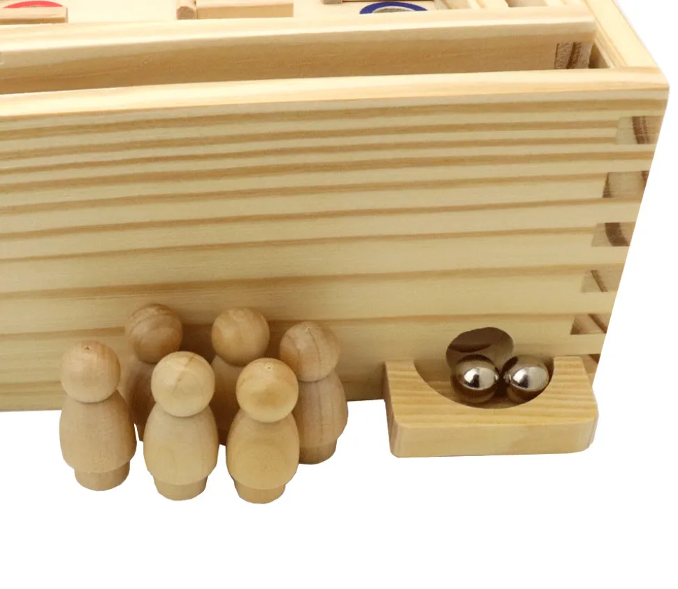 Un jeu de labyrinthe tout en bois. Bouger le plateau du labyrinthe et orienter la boule vers l’arrivée à travers le chemin indiqué en évitant les obstacles.